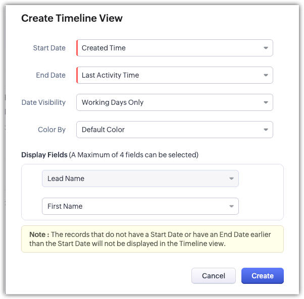 没有开始日期的记录或结束日期早于开始日期的记录将不会出现在时间轴视图中;它们仍然可以通过列表视图访问。只有开始日期(但没有结束日期)的记录将以无限期扩展的形式显示。