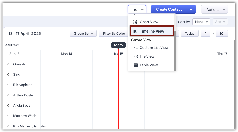Zoho CRM 中的时间轴视图是一种视觉布局,旨在根据记录的开始和结束日期清晰地组织它们。它帮助运营或销售入门经理等团队在时间轴上直观地跟踪正在进行、已完成和未来的任务,使识别工作量、持续时间以及任务状态变得更加容易。使用直观的颜色编码(已完成为绿色,正在进行为蓝色,即将到来为黄色),用户可以快速评估任务的进度,平衡团队资源,并在繁忙时期更有效地进行规划。