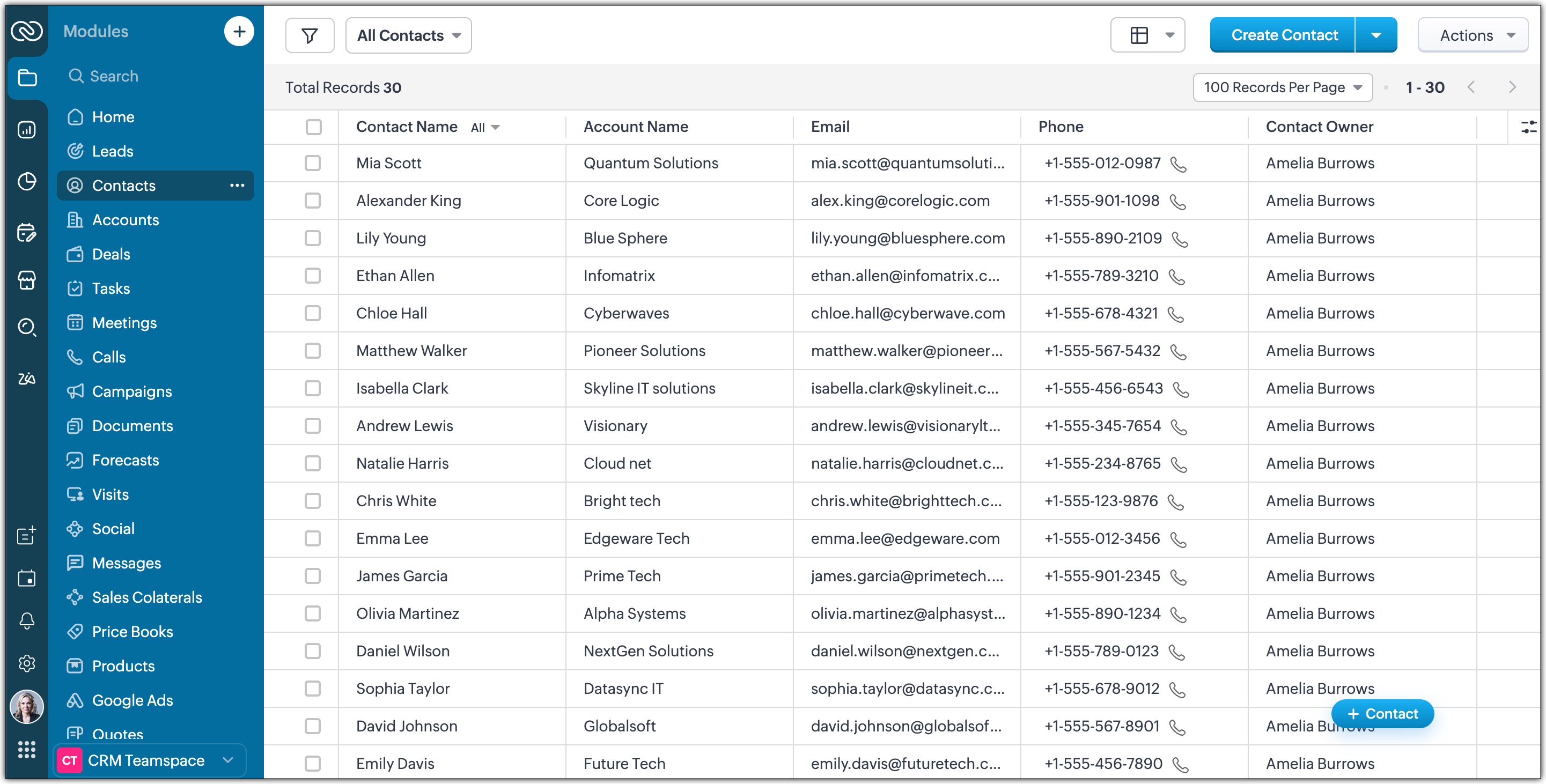Zoho CRM 的网格视图允许用户以表格形式查看模块数据。此功能提供类似电子表格的界面,用于管理和查看您的记录。使用此功能,您可以: