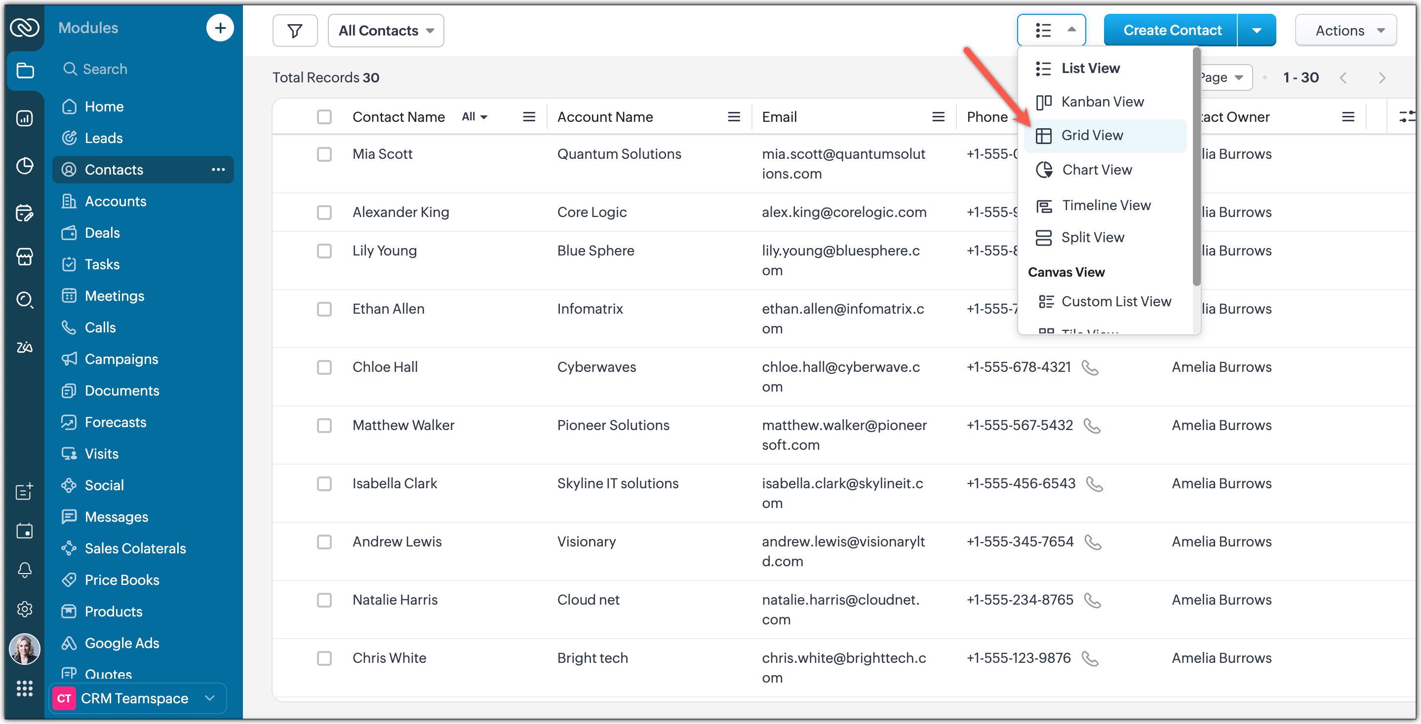 网格视图是特定于布局的。Zoho CRM 中的每个模块都服务于不同的目的。同样,您可以在网格视图中以特定布局查看模块数据,以获得定制的用户体验,其中:
