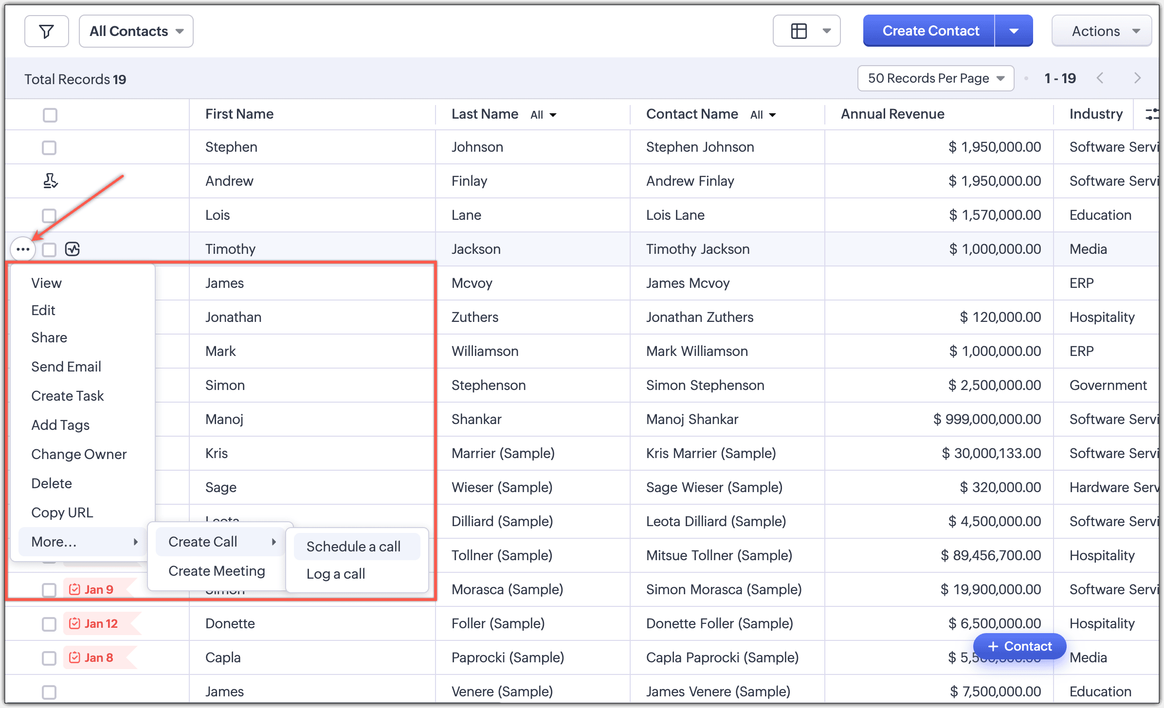 您还可以执行发送邮件、创建任务、添加标签、删除等各项操作。要执行上述操作,只需在记录上悬停时点击出现的(...)更多图标,选择并完成操作即可。