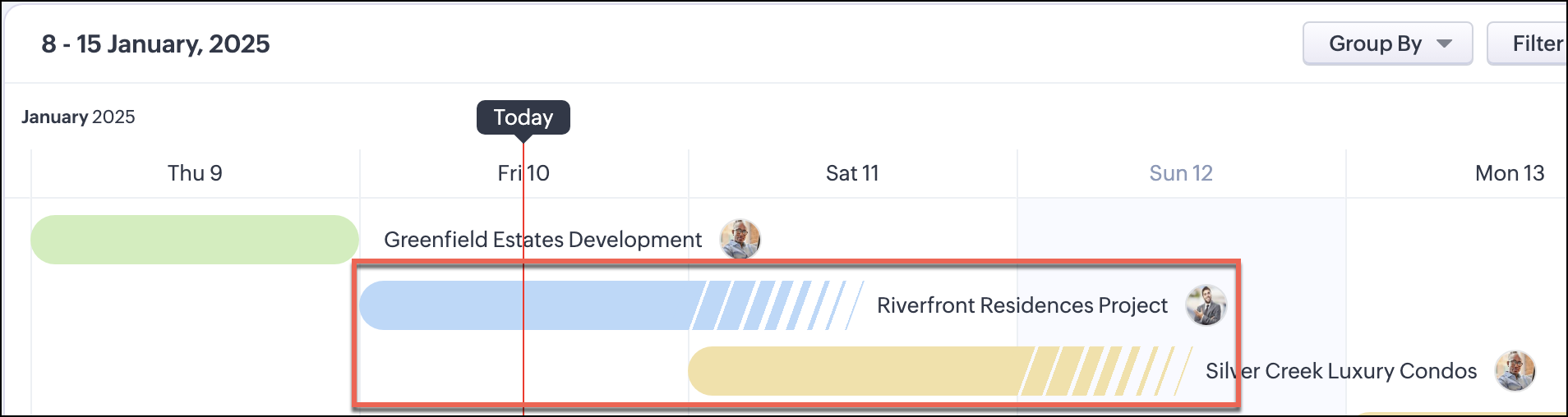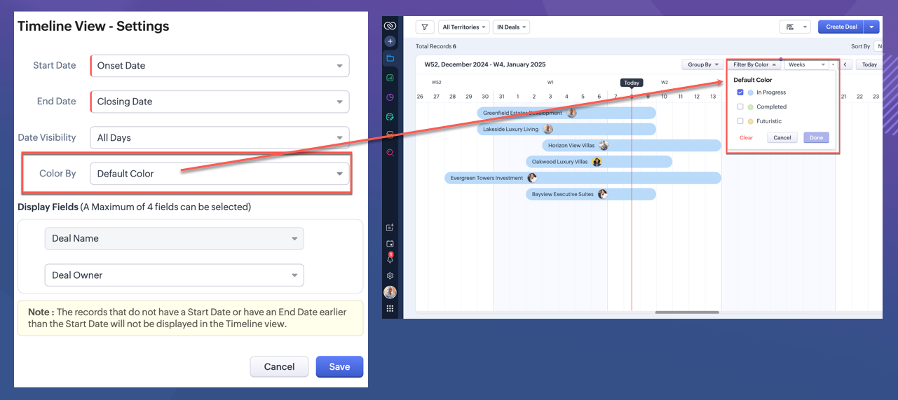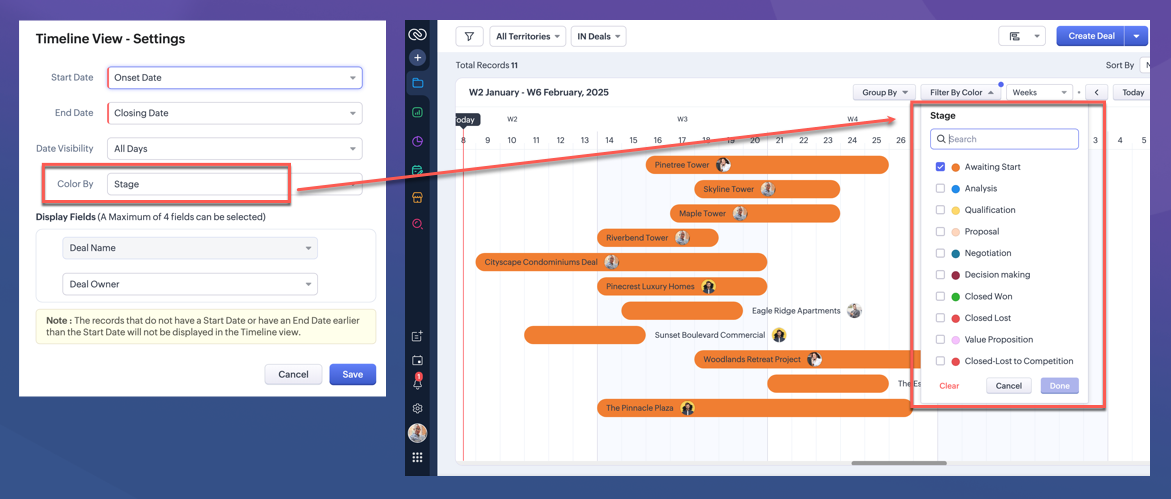 当您选择按颜色筛选时,您可以选择按默认颜色筛选,或者按在您的时间轴设置中选择的按颜色字段筛选。