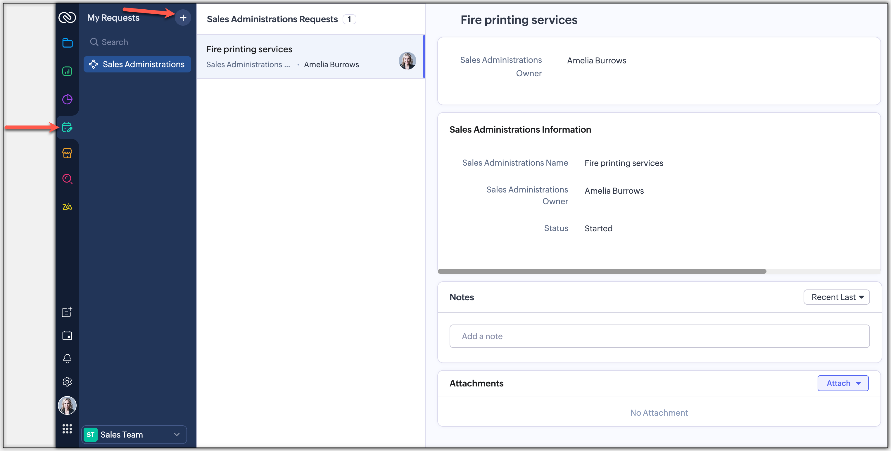 - 每个创建的请求都将作为新记录添加到团队模块中。您可以在请求者页签中跟踪您请求的状态。在侧边栏中选择团队模块,以查看该团队模块中的所有请求。