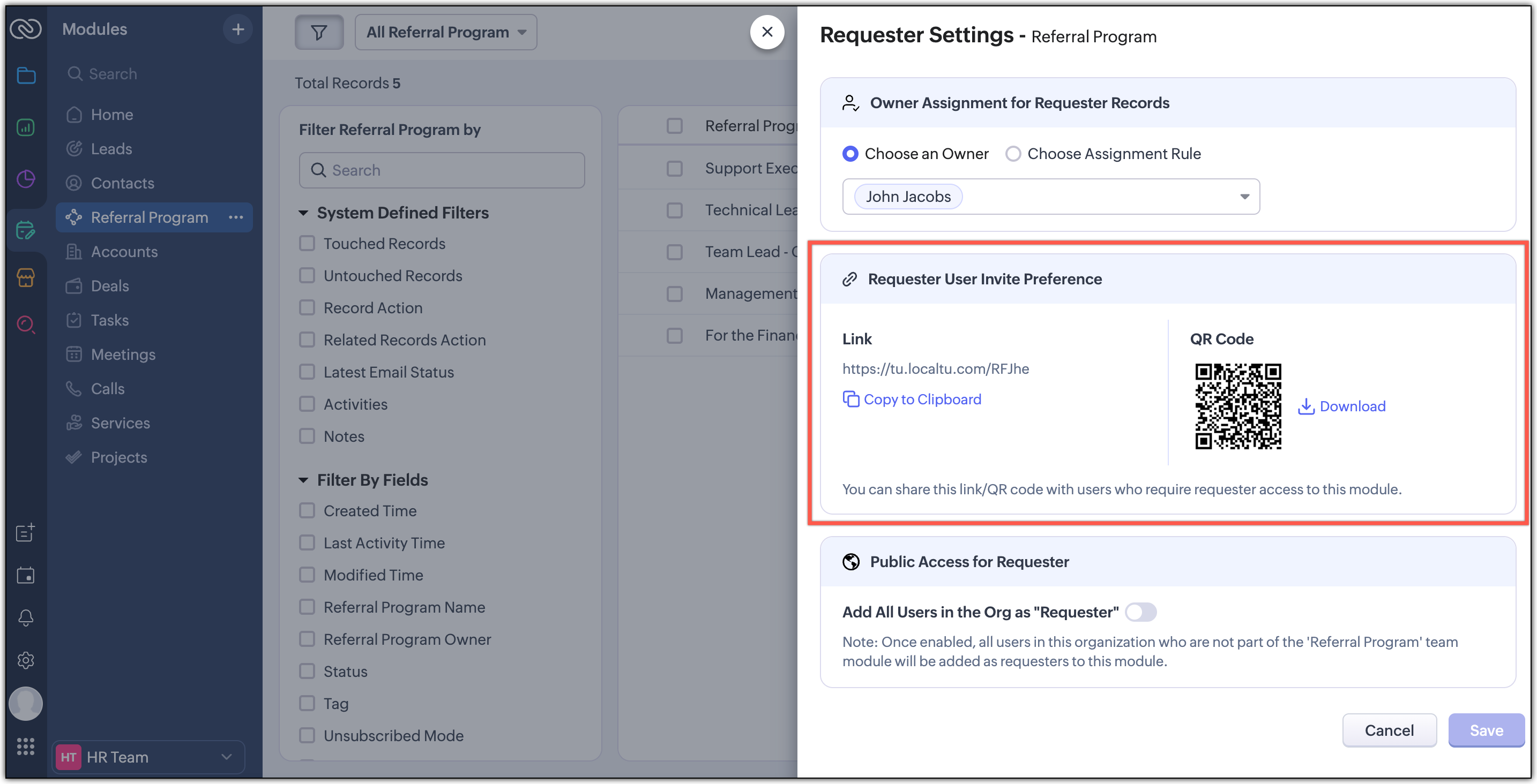 每个团队的工作方式都不同,请求者设置让团队可以根据自己的需求定义如何处理收到的请求。他们可以选择为新创建的记录分配新的所有者,通过二维码或链接邀请请求者,或者允许所有组织用户作为请求者。
