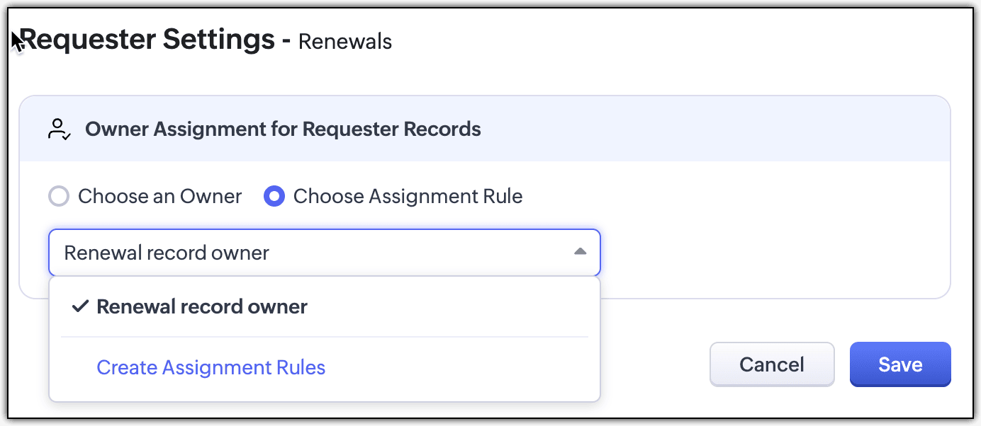 - 如果您想根据标准自动分配,可以为团队模块通过请求创建的所有记录设置一个分配规则。您可以从下拉菜单中选择一个分配规则或创建一个新的分配规则。