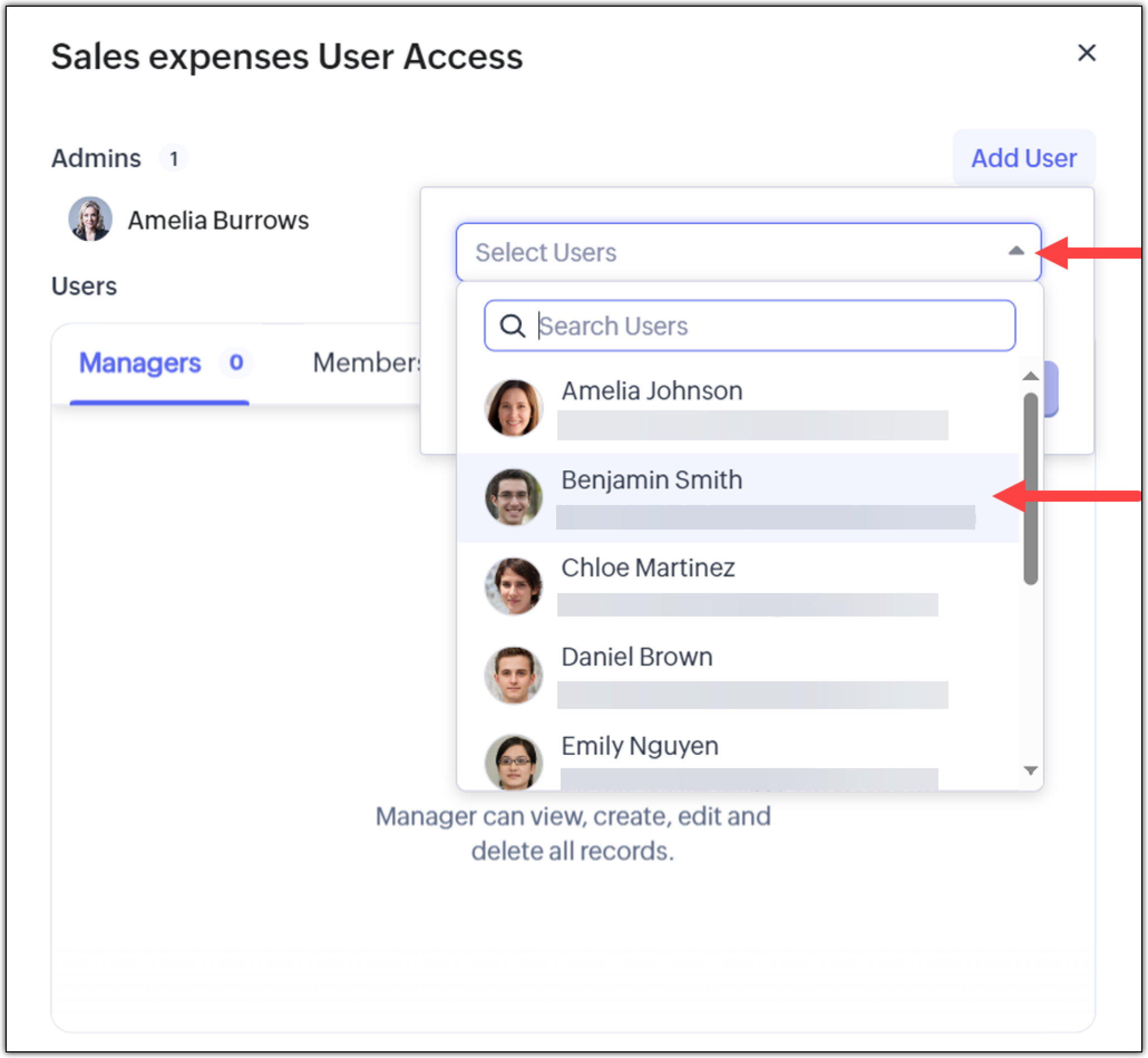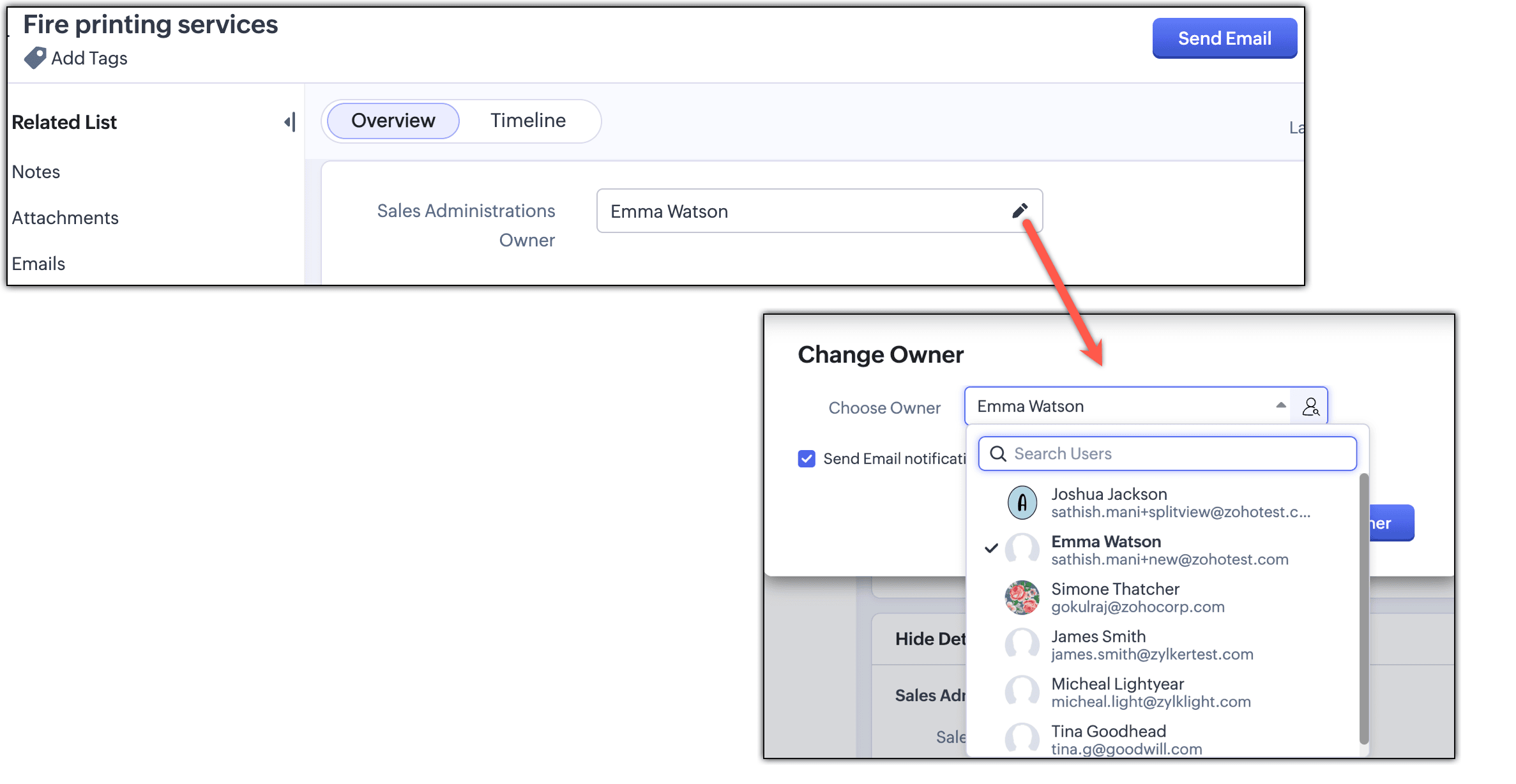 - 可选作为记录所有者的 5 个用户将从团队模块中的管理员、经理、成员和参与者名单中选择。