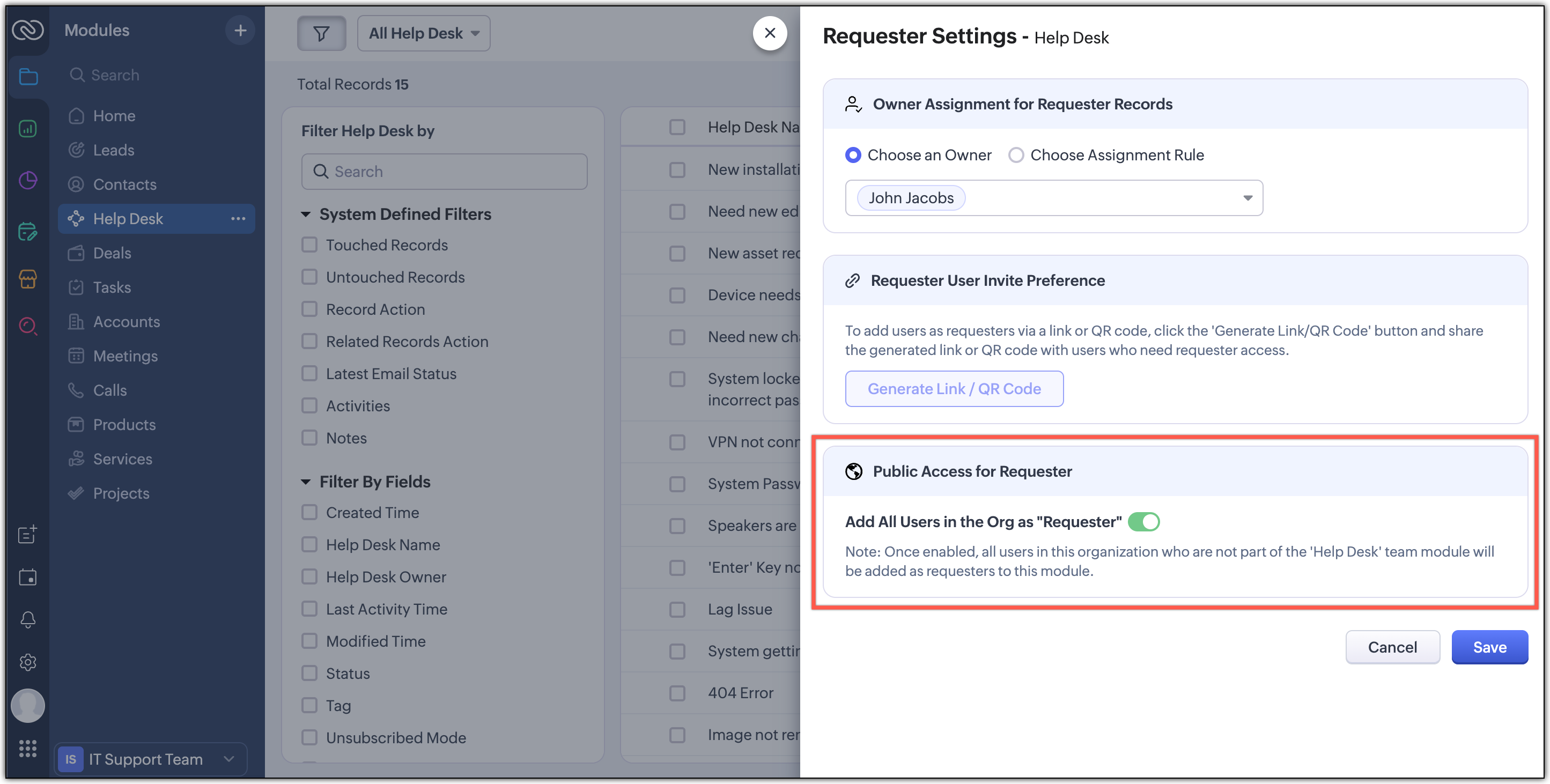 一旦收到请求,团队将在团队模块中处理这些请求。这个过程的第一步是将请求分配给合适的团队成员。您可以使用请求者设置选项将请求者页签或其它地方提交的请求创建的记录的所有权转移。您可以选择分配多个所有者,或者为该团队模块的任何请求建立分配规则。
