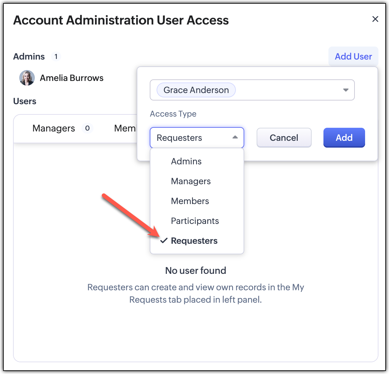 - 将访问类型选择为请求者,并为这些用户点击添加。
