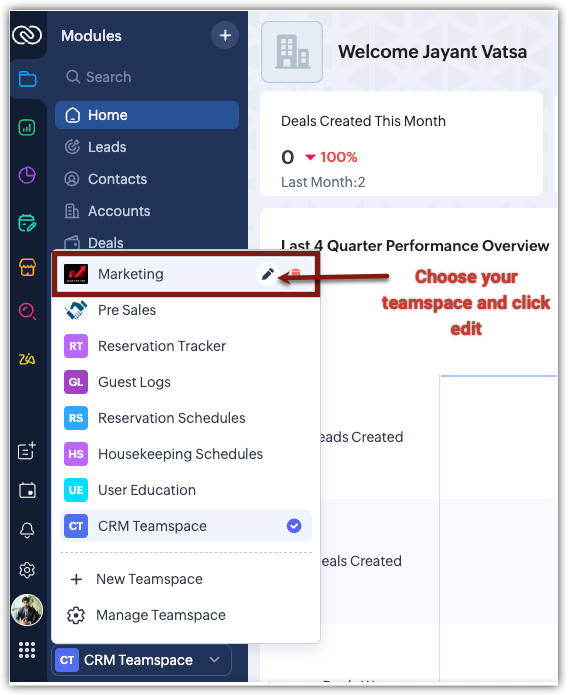 此外,一旦在您的团队空间中创建了文件夹,您可以使用CRM中次要侧边栏中的“管理模块”选项向团队空间添加模块。