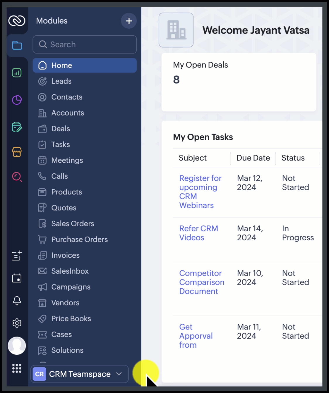 Zoho CRM全员版使用户能够在他们的CRM系统中建立各种团队空间,以适应不同的需求,并直接在CRM中促进团队之间的协作。有了多个团队空间,它们之间的切换必须是无缝和直接的。为了解决这个问题,我们引入了一个团队空间切换器的功能,可以让您