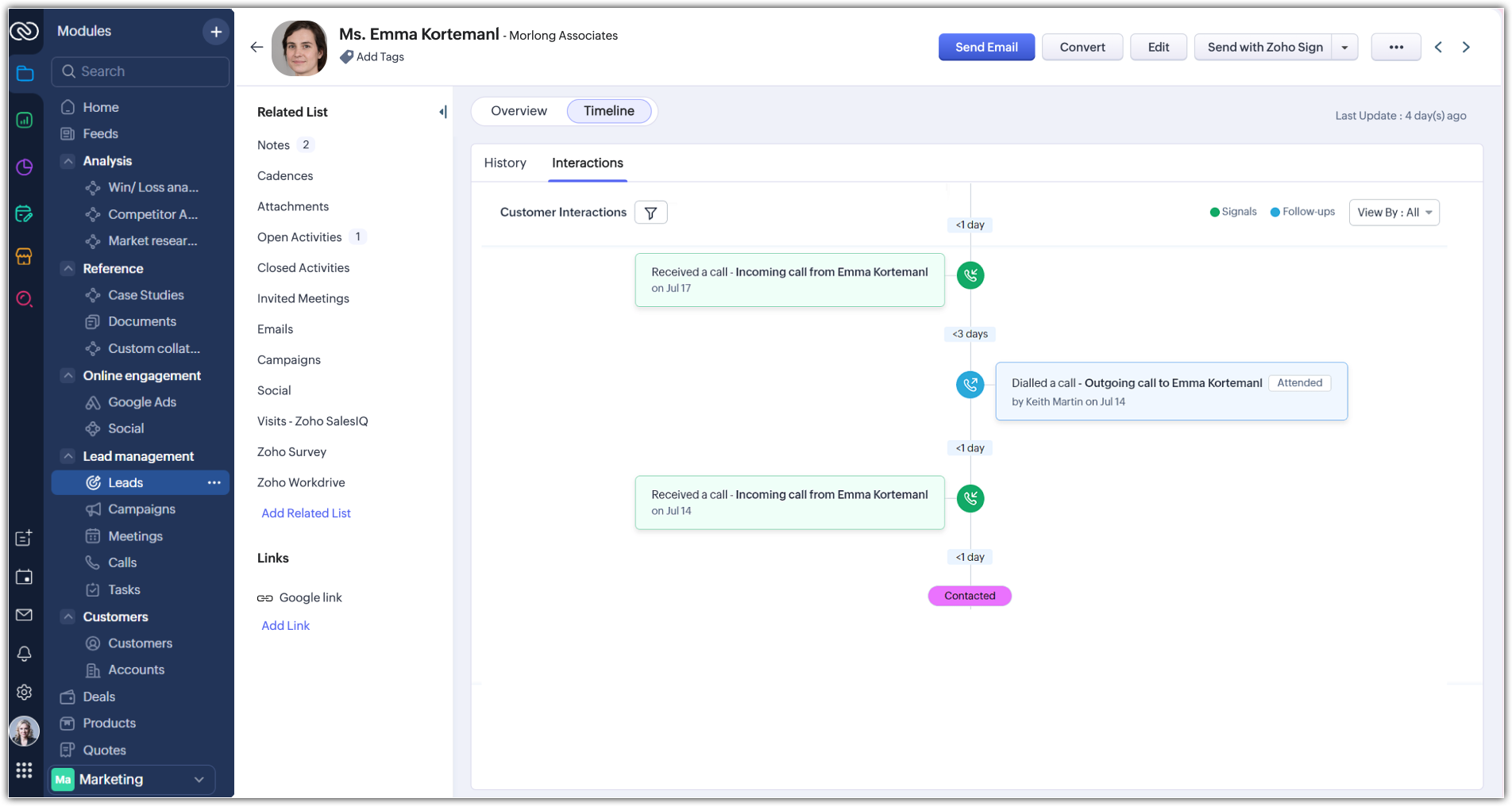 通过连接的记录,用户可以通过无缝链接这些模块内的记录,在您的 CRM 系统中即时建立两个模块之间的连接。此功能提供了对 CRM 记录中交互和关系的统一视图。它通过连接团队和组织模块,帮助您获得更好的洞察力,简化流程,并促进协作。