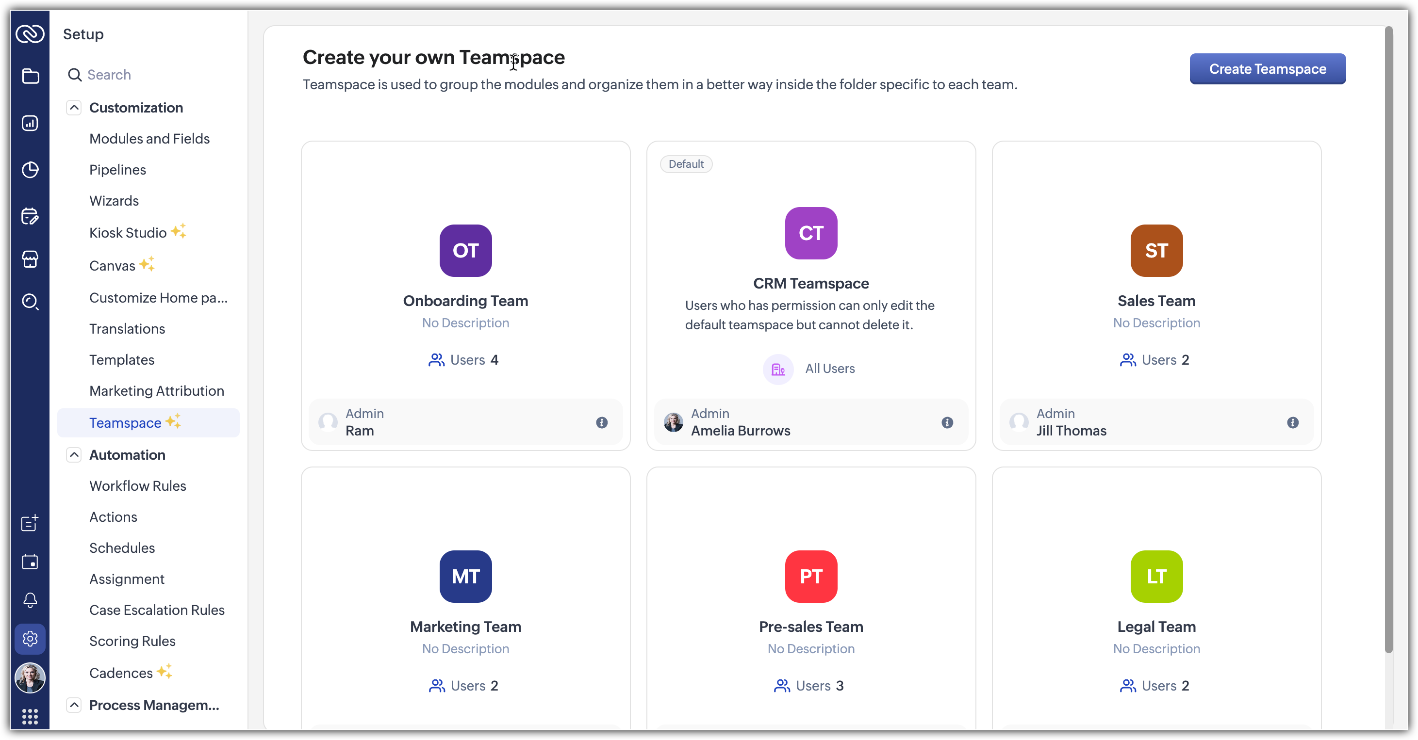 由于多个团队可以在单个 CRM 平台上协同工作,因此每个团队都需要定义自己的流程。这些流程将记录在团队模块中。