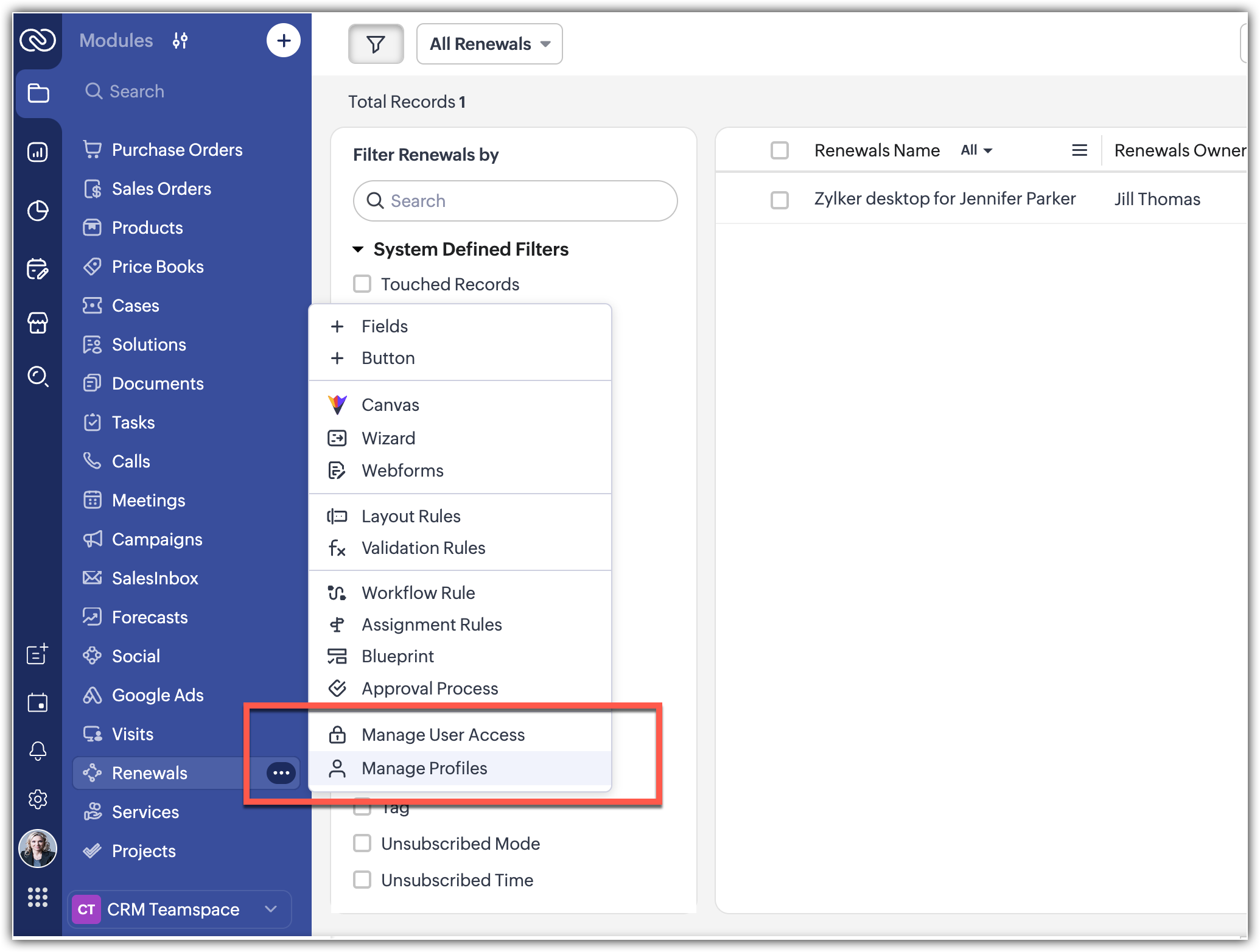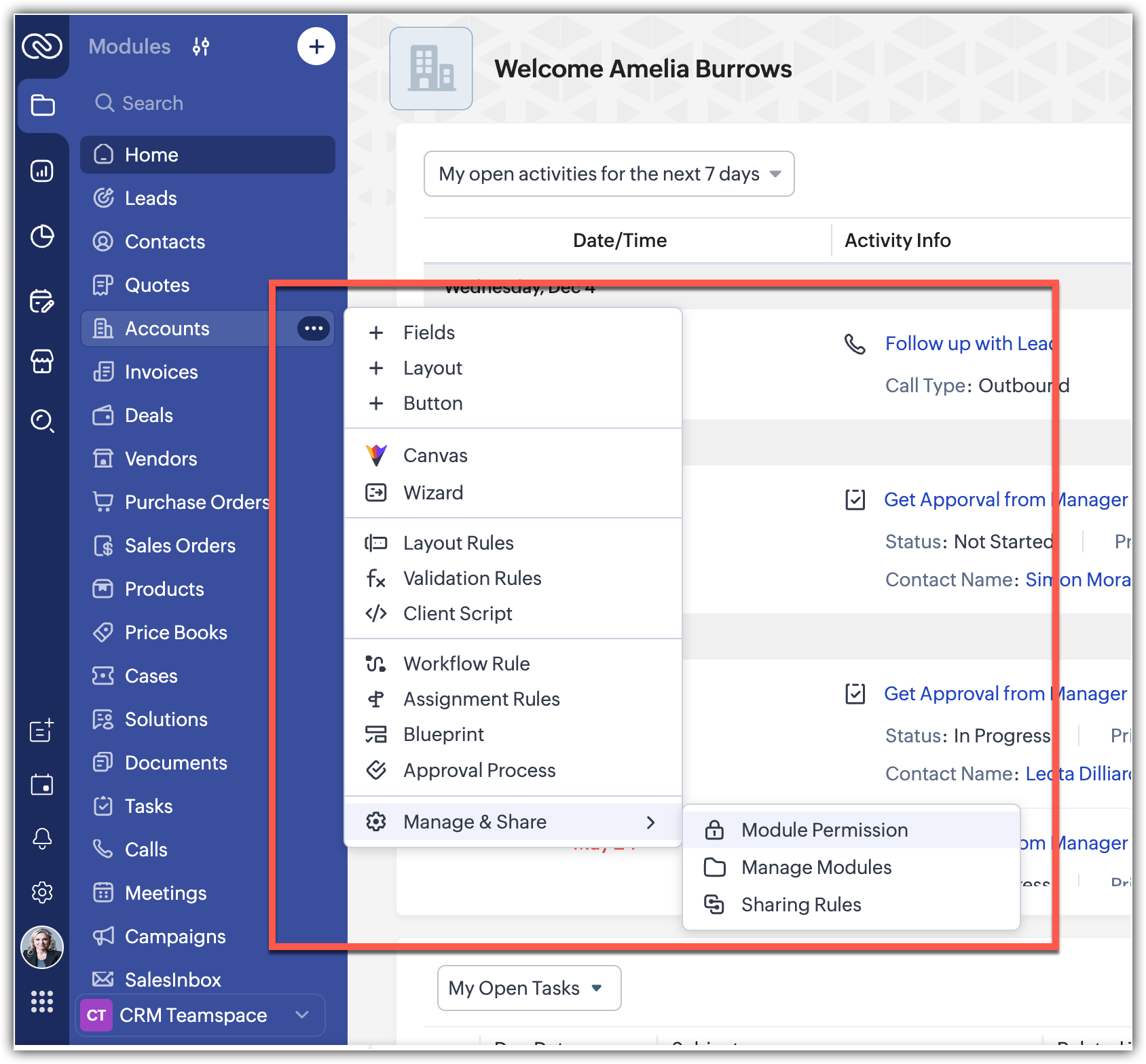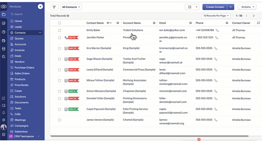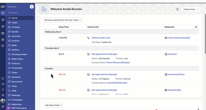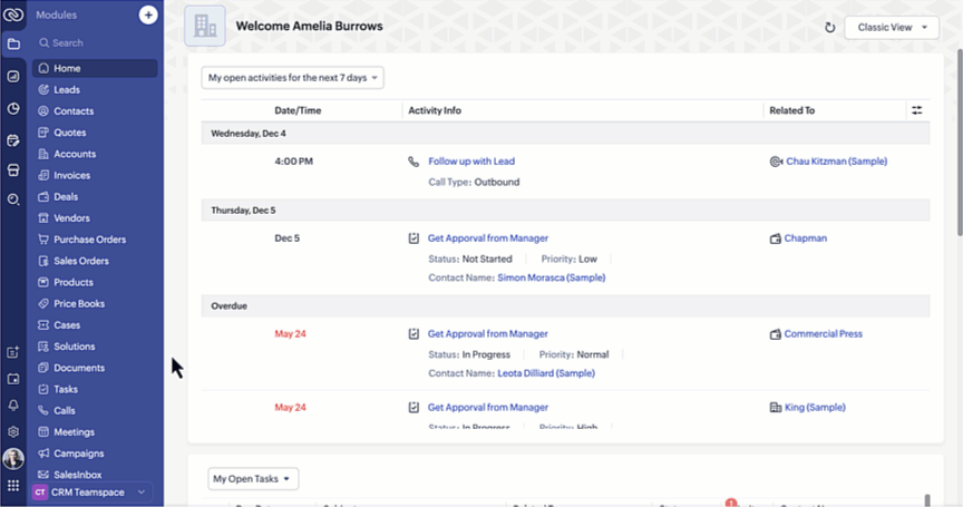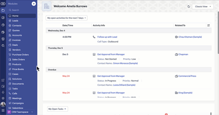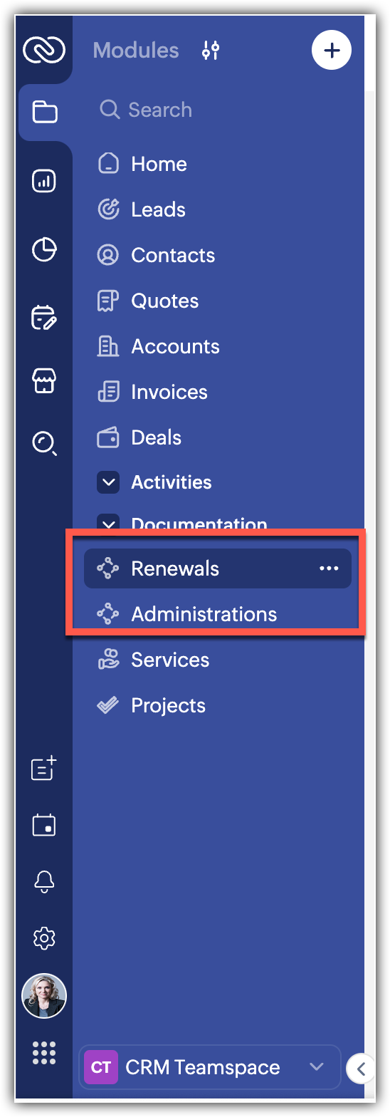 - 左侧菜单垂直组织所有关键模块,使您在 CRM 中导航更加便捷,无需过多滚动或点击。