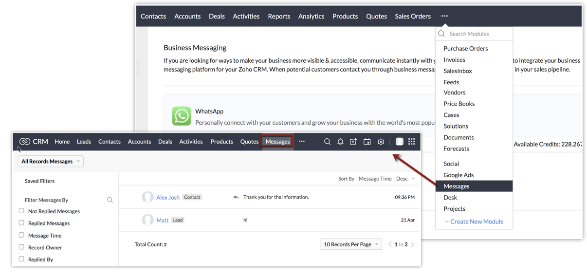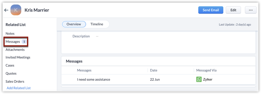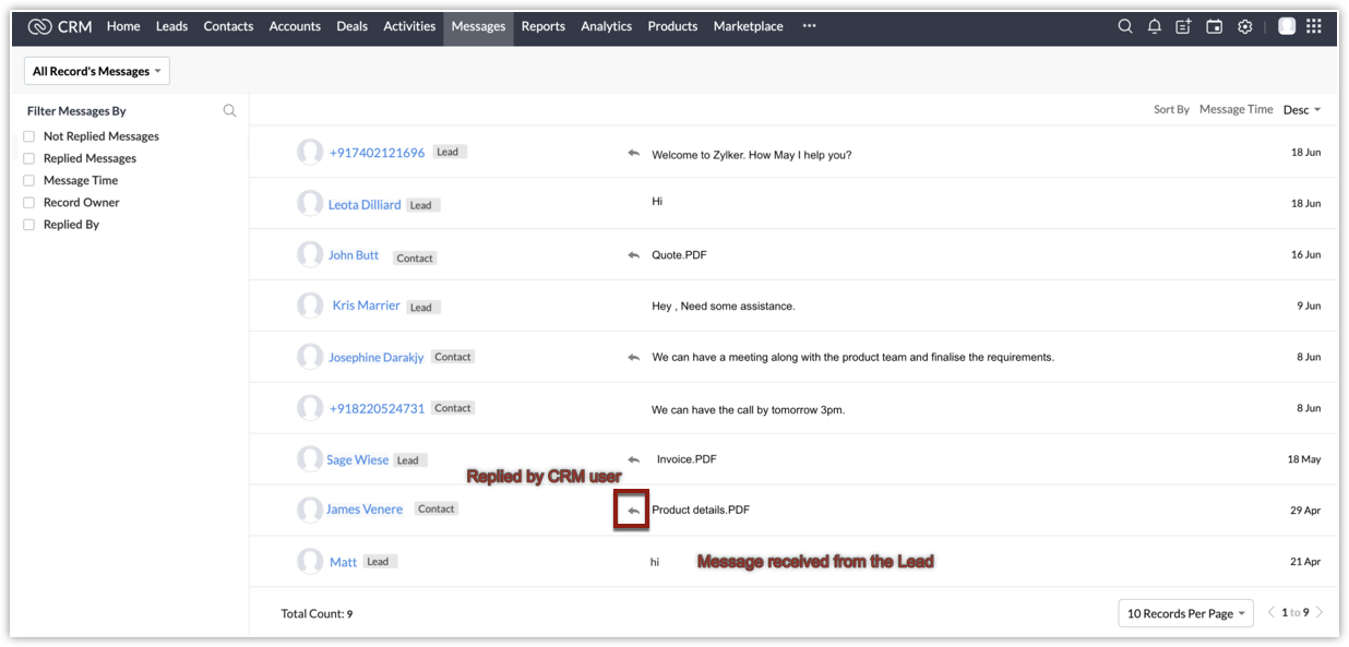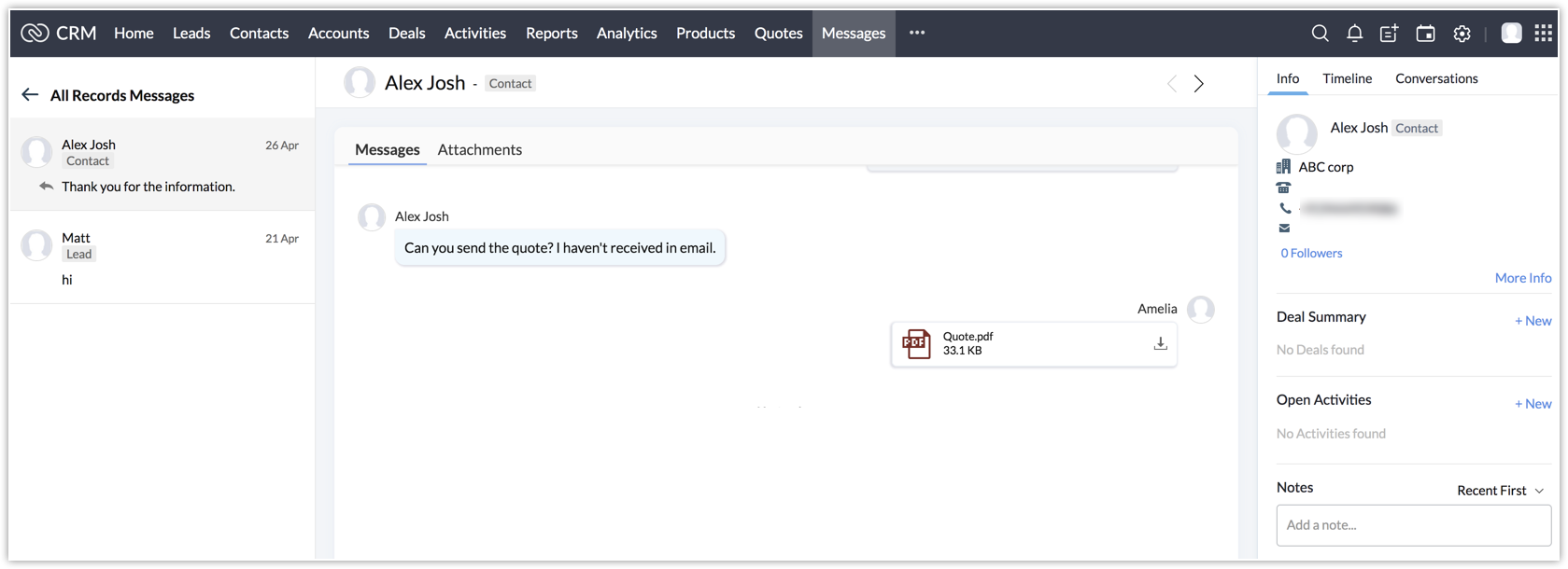根据配置期间设置的帐户首选项,将在线索或联系人模块中找到从客户接收到的消息。 一旦收到消息,它将自动关联到线索或联系人,并且可以从消息相关列表中访问。