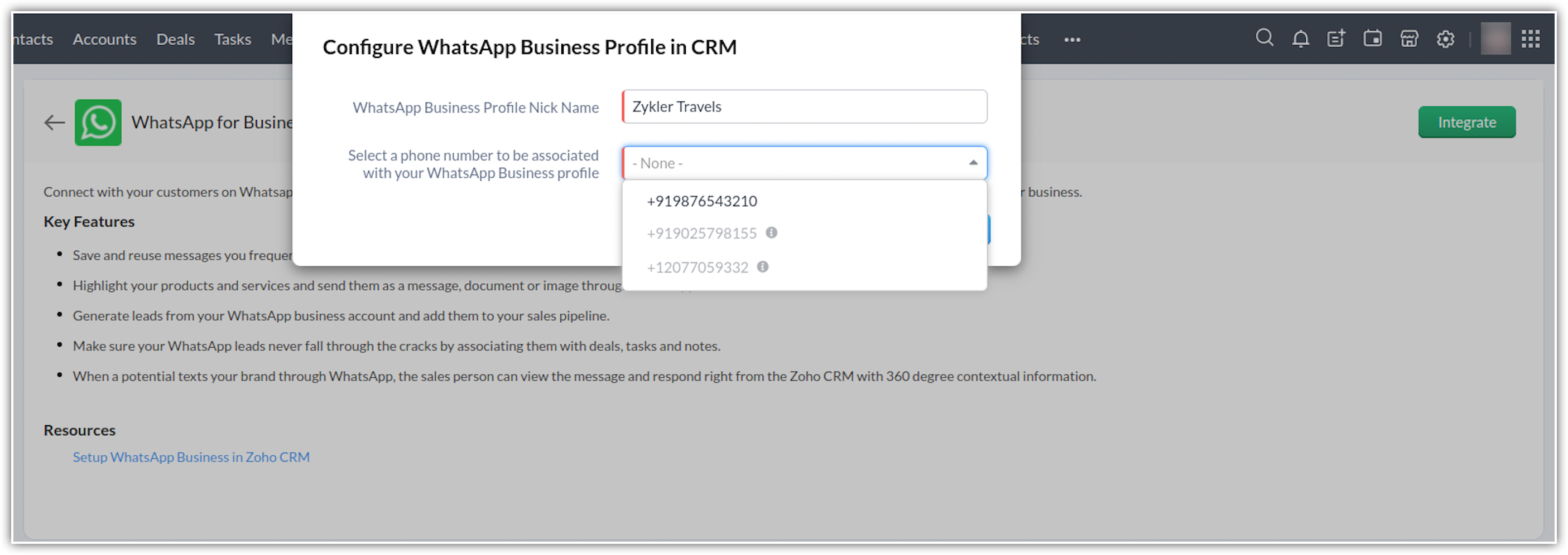 为了帮助企业通过CRM帐户来与客户进行业务消息的交互,并保存这些交互的记录,Zoho CRM提供了与WhatsApp的无缝集成。 只有管理员可以发起此集成。