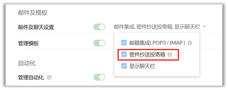 - 在设置权限 > 邮件及模板 > 邮件及聊天设置,选中密件抄送投寄箱复选框。