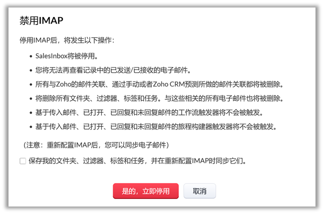 如果电子邮件集成被禁用,管理员会收到提醒,选择是否保存文件夹,过滤器,标签等。