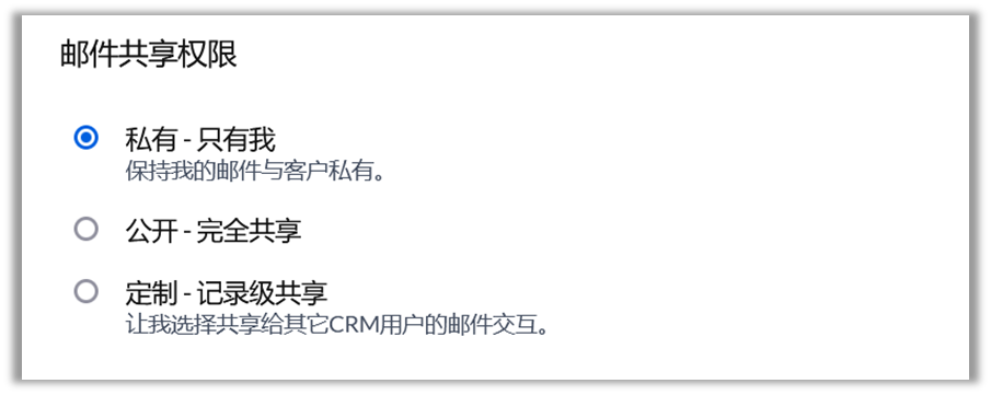 - 在邮件共享设置,根据需要选择私有,公开或者自定义记录级别的共享。