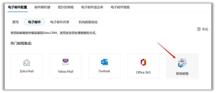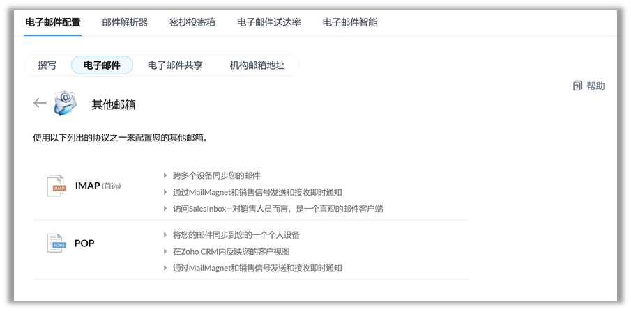 在Zoho CRM中,电子邮件可以与不同服务商通过IMAP和POP进行集成,还可以通过API为Outlook等提供电子邮件集成。
