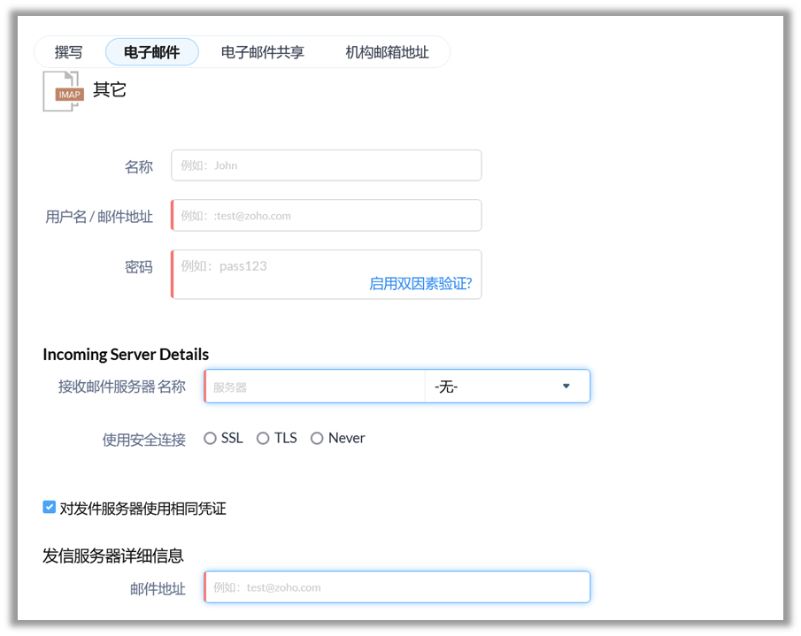- 在选择热门IMAP集成时,会自动填充服务器详情。