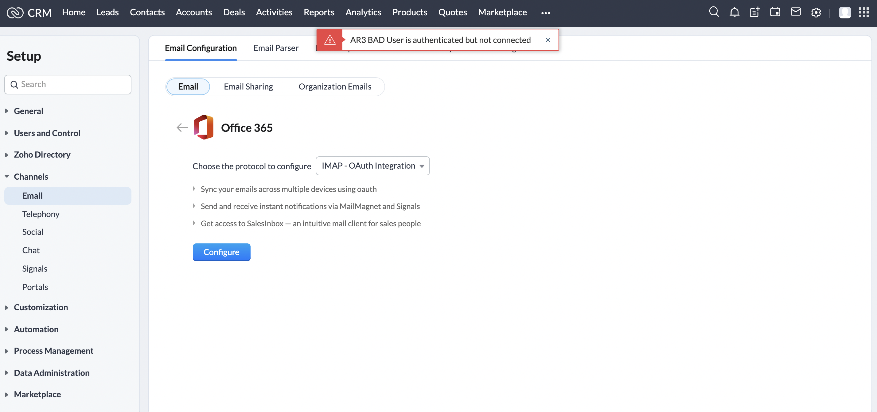 - 在Zoho CRM中,进入设置> 沟通渠道>电子邮件> 电子邮件配置。