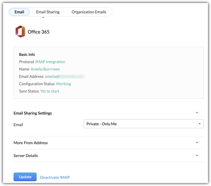 - 配置成功后,将被重定向到Zoho CRM IMAP或POP配置页面。同步工作将在之后完成。