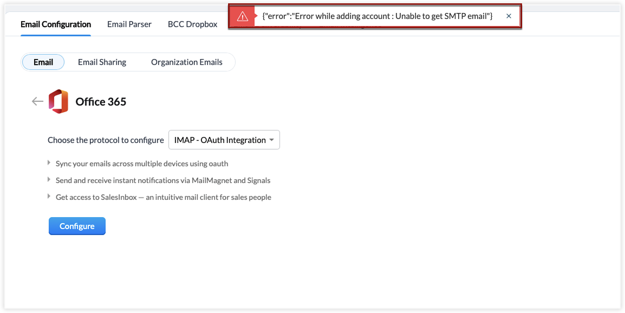 当您通过IMAP-OAUTH或POP3-OAUTH协议与Office 365或MS Outlook集成时收到报错“无法获取SMTP邮件”,请使用以下解决办法。