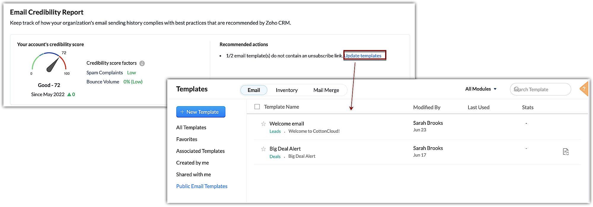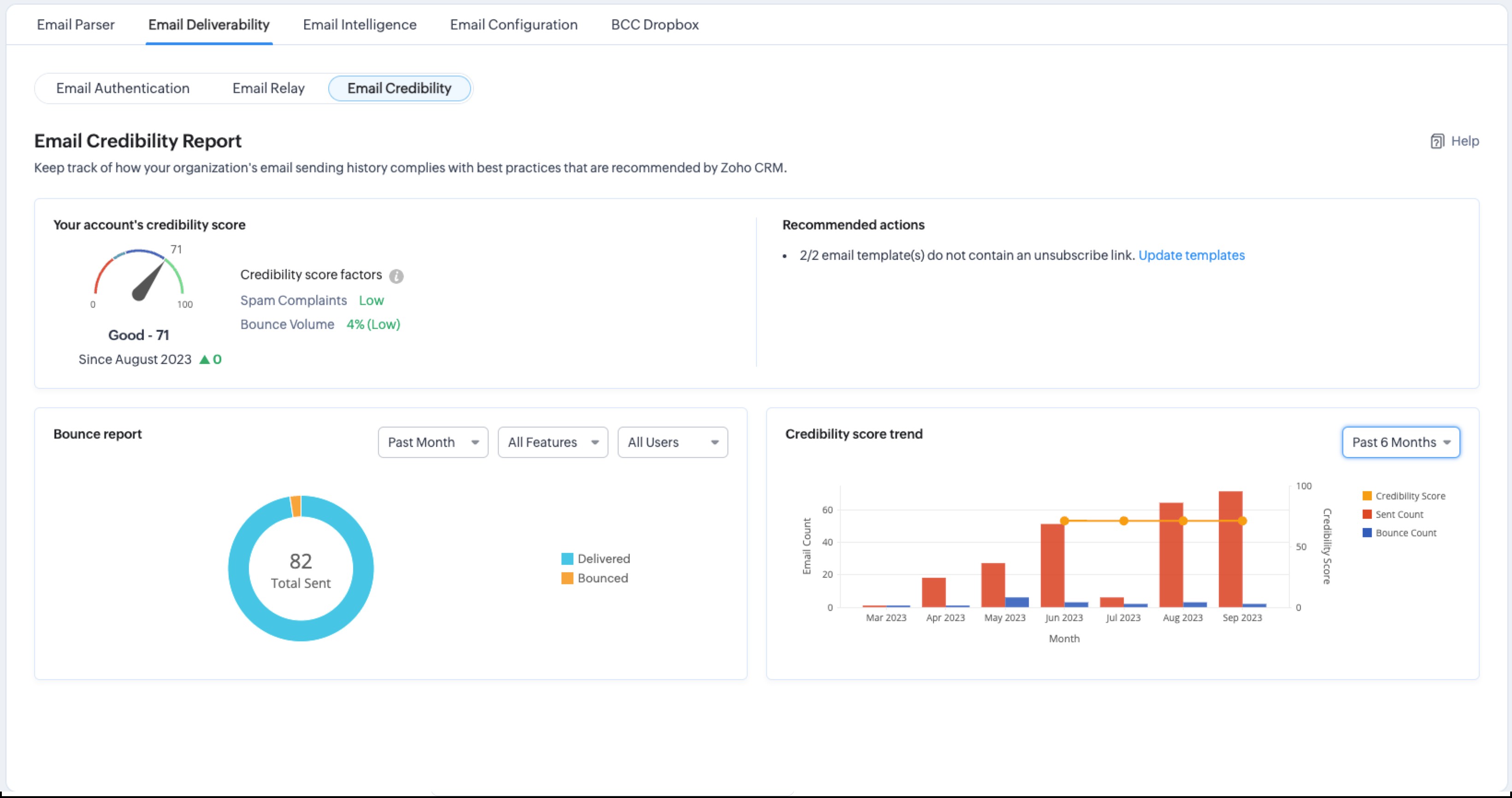 为了抑制这种多米诺骨牌效应,帮助减少差的可信度得分,并帮助您自我评估发件人的声誉,Zoho CRM会分析您的电子邮件发送实践,并为您提供电子邮件可信度报表。