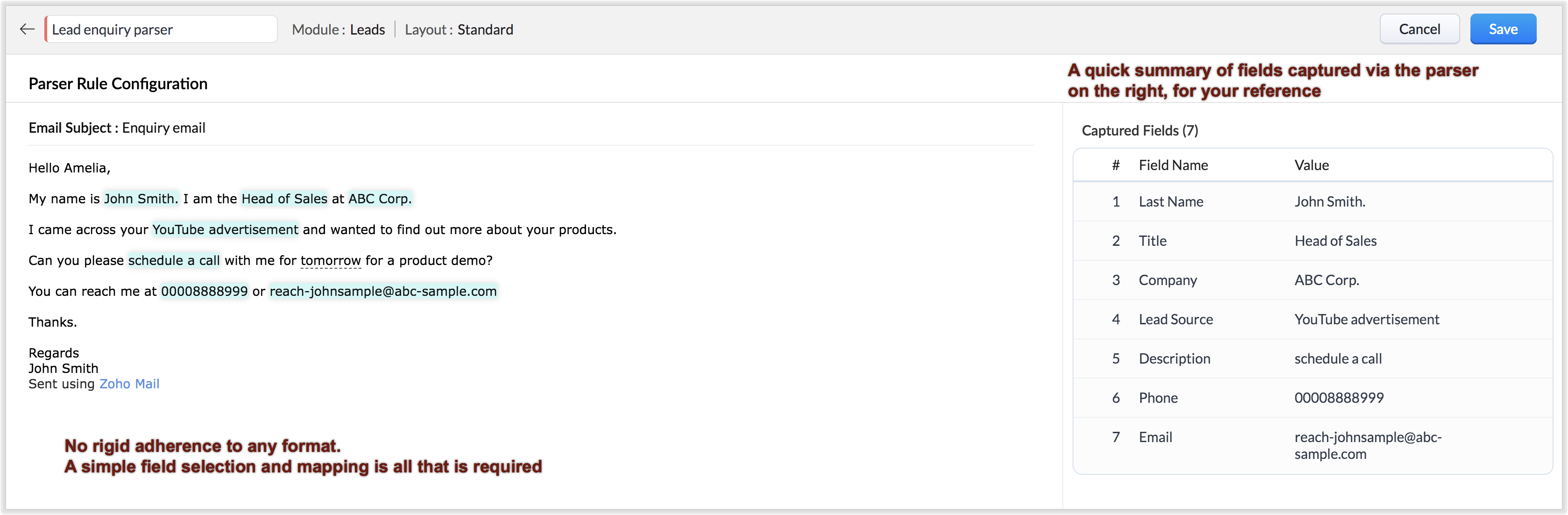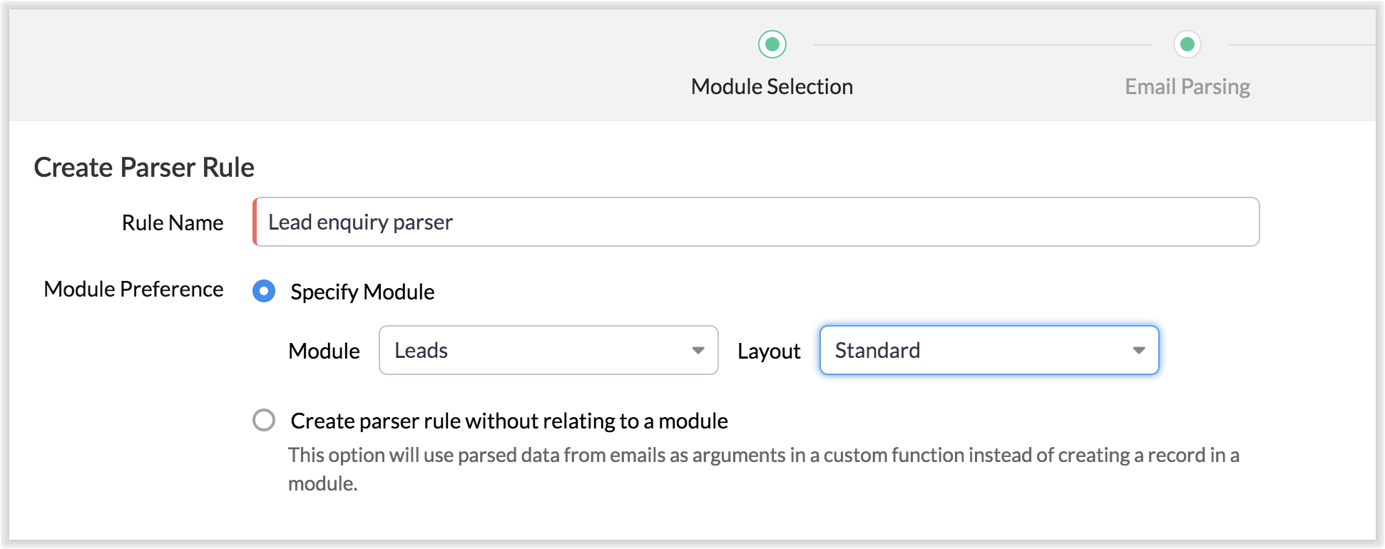 现在,您可以在同一模块下为不同的布局配置邮件解析器规则。 例如,如果您有两个布局 - 产品查询和服务查询 - 在线索模块下,您现在可以解析相应布局中的数据,并从查询源组织数据。