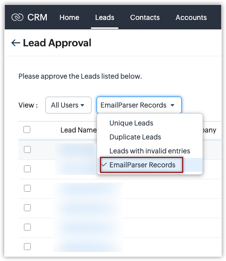 在线索审批页面,从下拉列表内选择邮件解析记录。所有通过邮件解析器创建的记录都会列出来。您可以手动批准所需的记录,这些记录现在将成为CRM数据库的一部分。