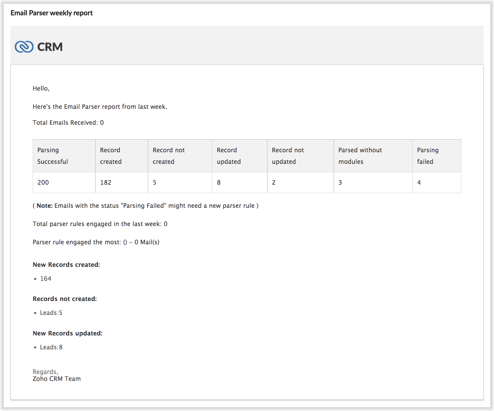 在新版的邮件解析器中,您可以准确、详细地了解每个规则解析的电子邮件数量、提取的字段以及与通过解析器创建的记录关联的自定义操作列表。 这个细节摘要可以让您清楚地了解规则的有效性,并指出您可能需要根据这些见解对这些规则进行的修改。 详细的每周性能报表可以发送给这些规则的创建者或自定义电子邮件ID。 当记录创建失败时,还会发送电子邮件报表,以便用户可以立即采取行动。