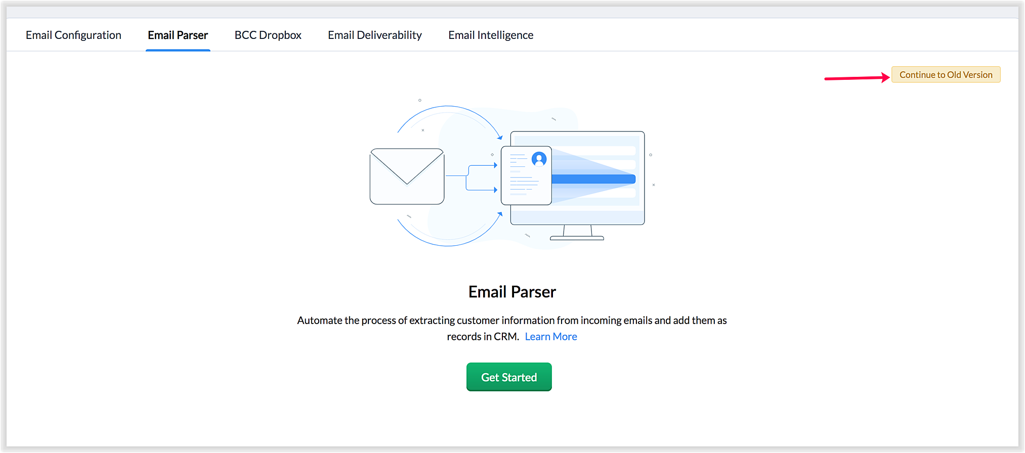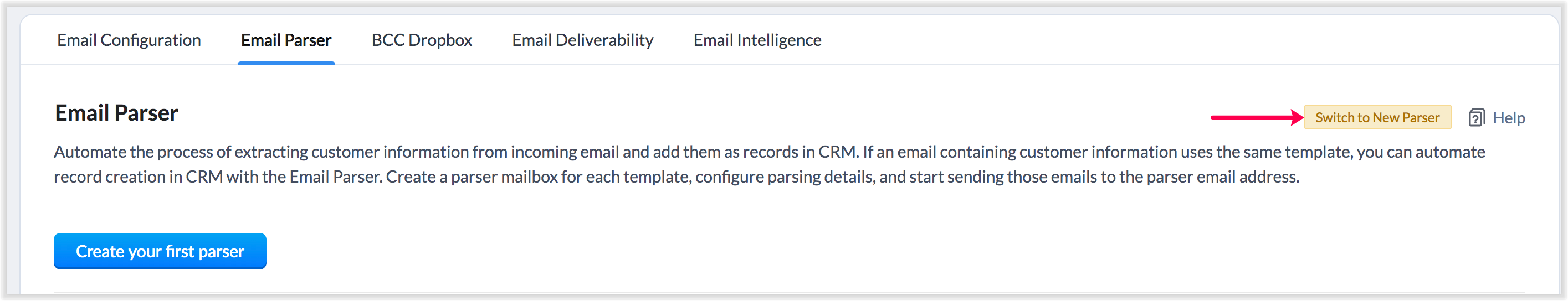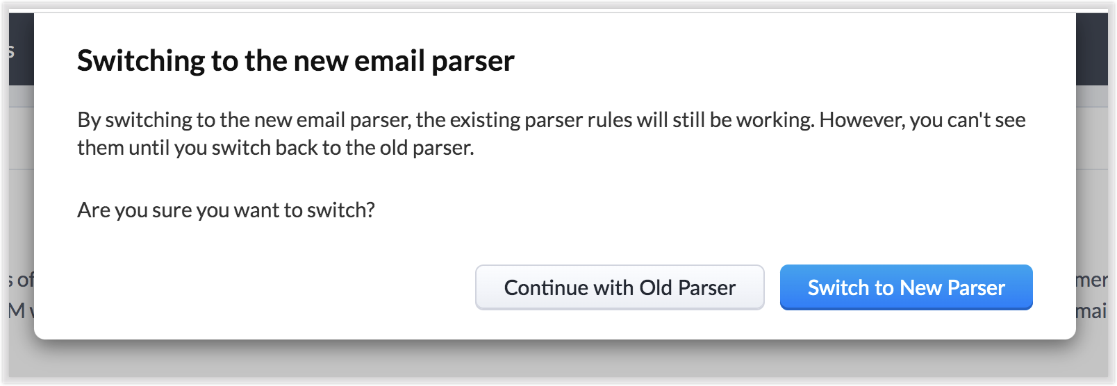 - 访问 设置> 沟通渠道 > 电子邮件 > 邮件解析器,然后点击切换到新解析器。