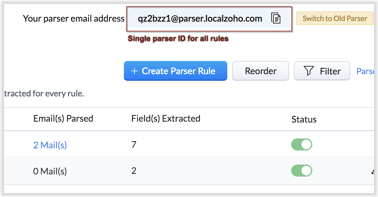 是的,即使在您切换到新的解析器之后,旧的解析器规则仍然完好无损并继续发挥作用。 满足旧解析器规则标准的电子邮件将继续被解析,即使您已经激活了新的解析器。