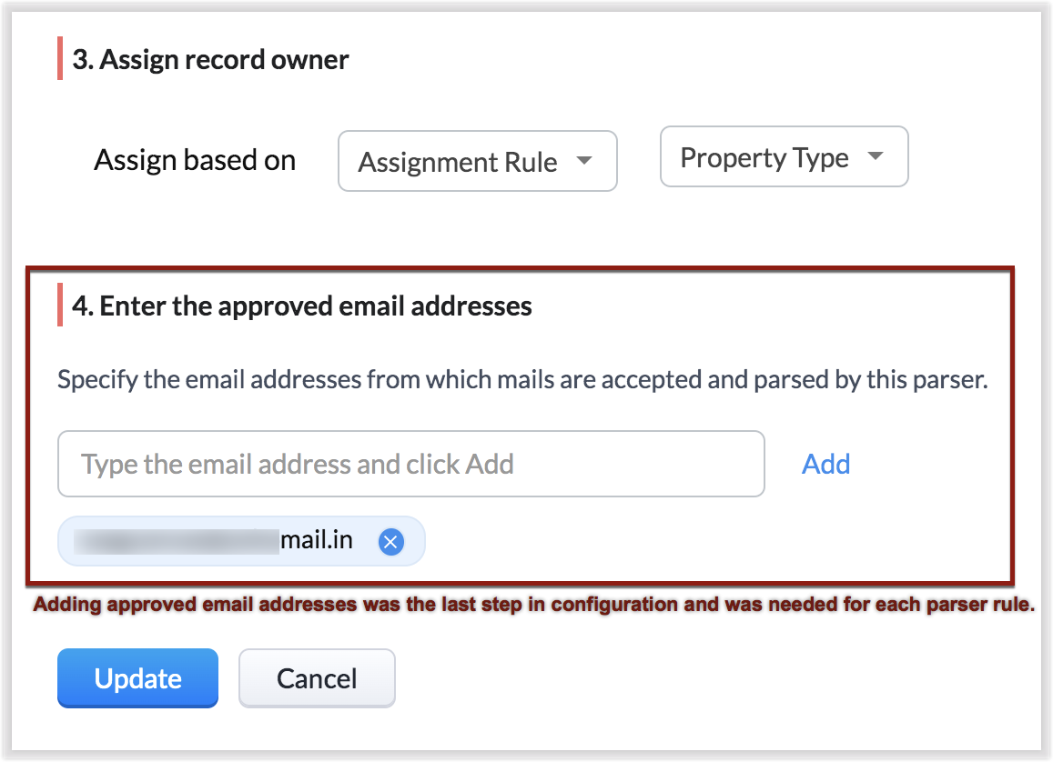 Update Record(更新记录) 是一个函数,您可以使用收到的解析邮件来更新记录上的最新信息。