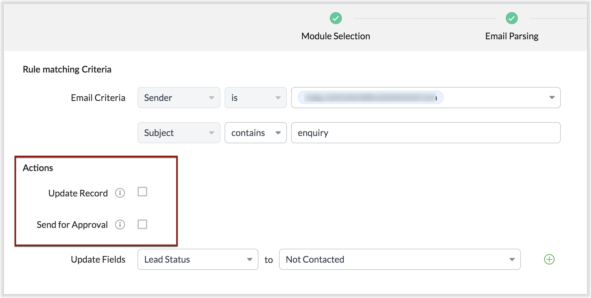 要显示更新记录选项,您必须首先从电子邮件内容映射“电子邮件”字段,该字段用作记录的主要标识符或“唯一性字段”。
