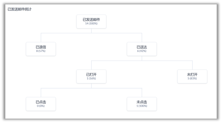 您可以从邮件摘要页面查看已发送邮件的统计信息。统计信息将显示已发送、已打开、已点击、已退回、已投递、未打开和未点击的邮件数。此外,您可以通过点击每个类别来查看收件人列表。