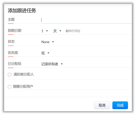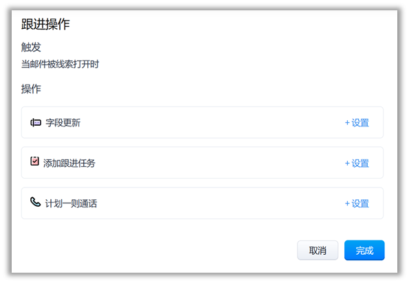 您可以设置在打开、点击或退回邮件时触发操作,例如字段更新、跟进任务或安排通话。