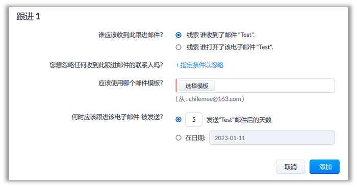 当向收件人群发邮件时,您也可以安排跟进邮件,可在规定的时间之后发送。比如说您在第 1 天向客户发送欢迎邮件,然后可为收到或打开了欢迎邮件的客户添加跟进邮件。您可以选择跟进邮件的发送日期或指定天数,跟进邮件必须在这个天数之后发送给客户。