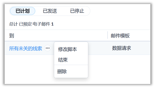 从群发邮件摘要页面,您可以查看已计划、已发送和已停止的邮件列表。已停止或已计划的邮件将在对应的文件夹中显示,您可以选择编辑它们。您可以在邮件中执行下列操作: