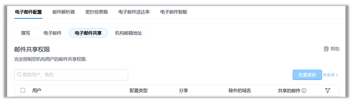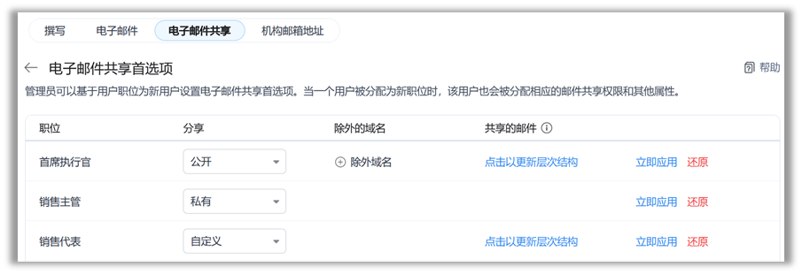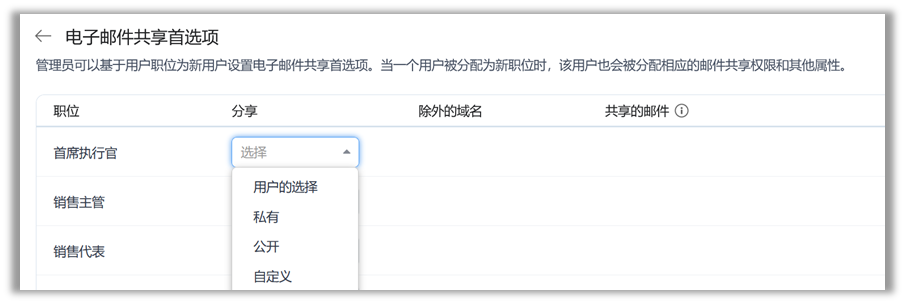 因此,一旦用户被分配到某一角色,预先定义的电子邮件共享权限就会应用。此外,排除的域和邮件可分享的角色和职位也应用。
