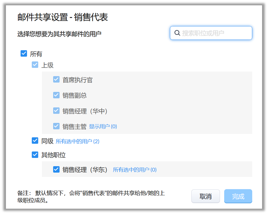 6. 在 电子邮件共享设置 页面, 选择职位,同级或其它下属职位。
