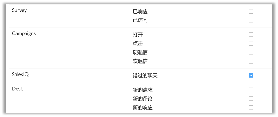 - SalesIQ - 您必须激活 Zoho SalesIQ 集成才能为错过的聊天启用销售信号。