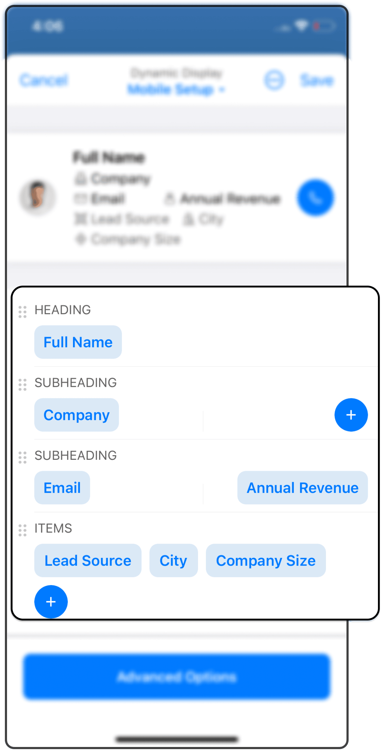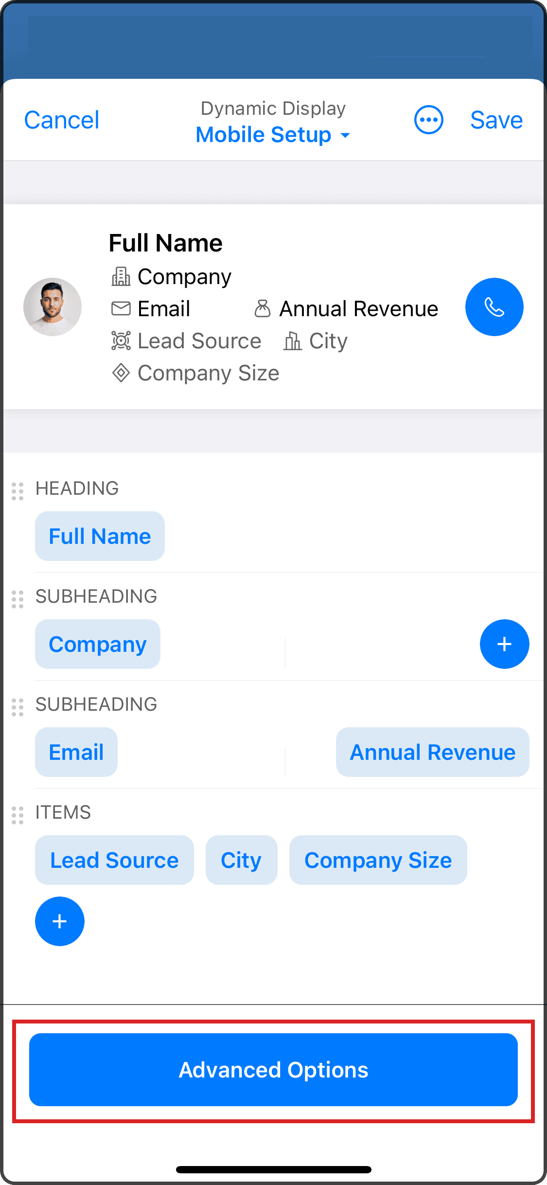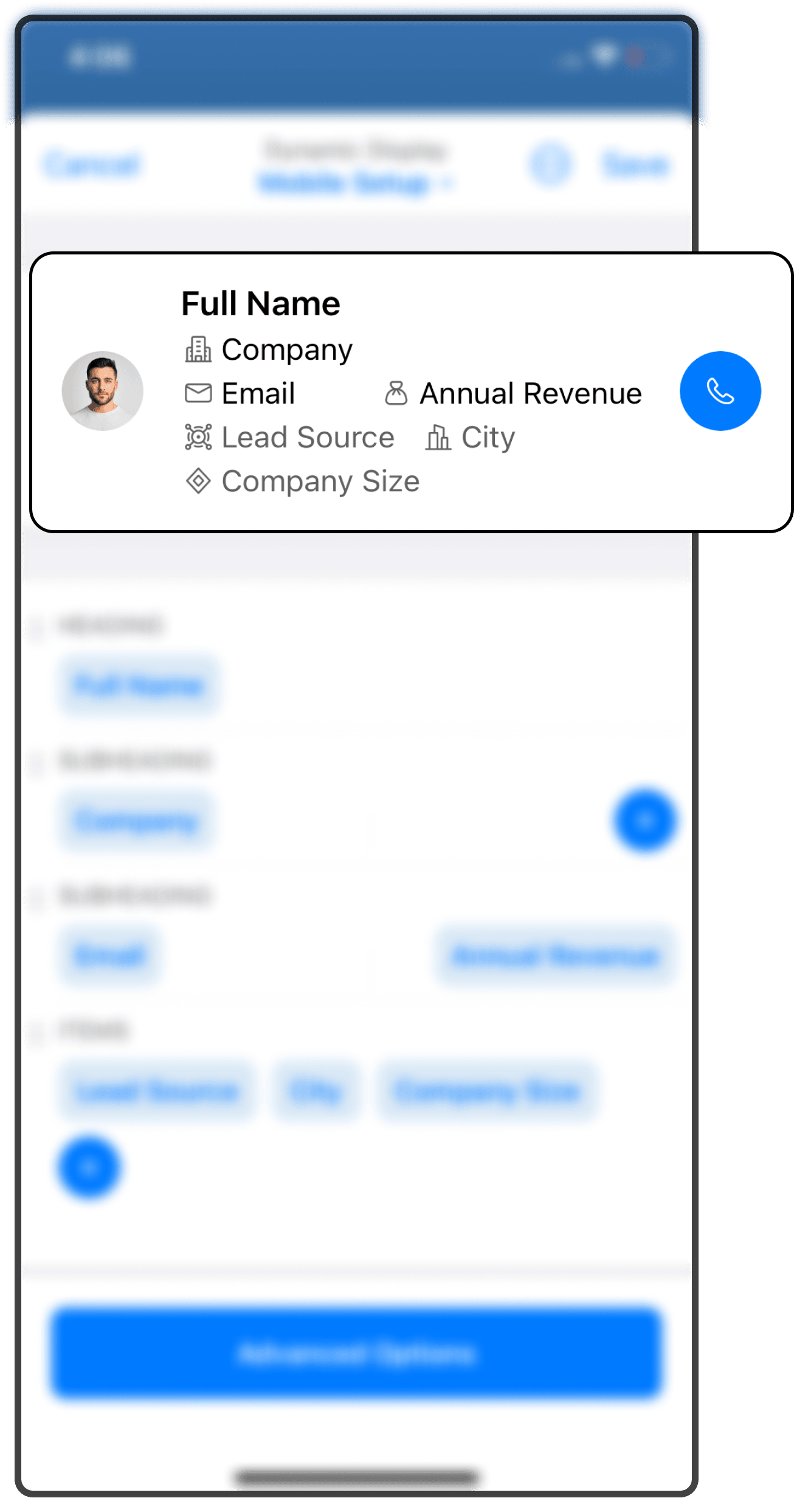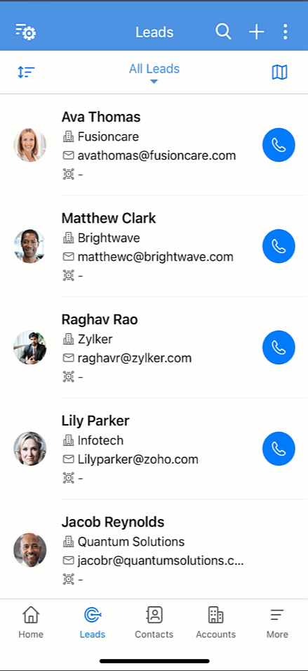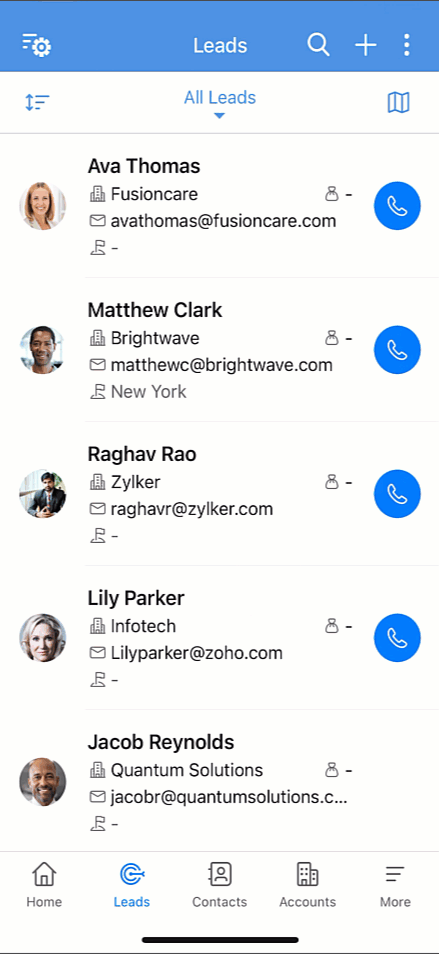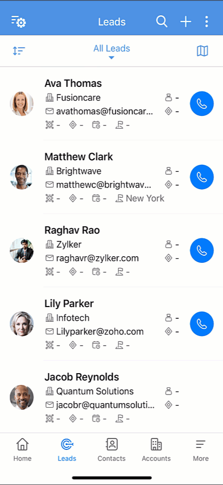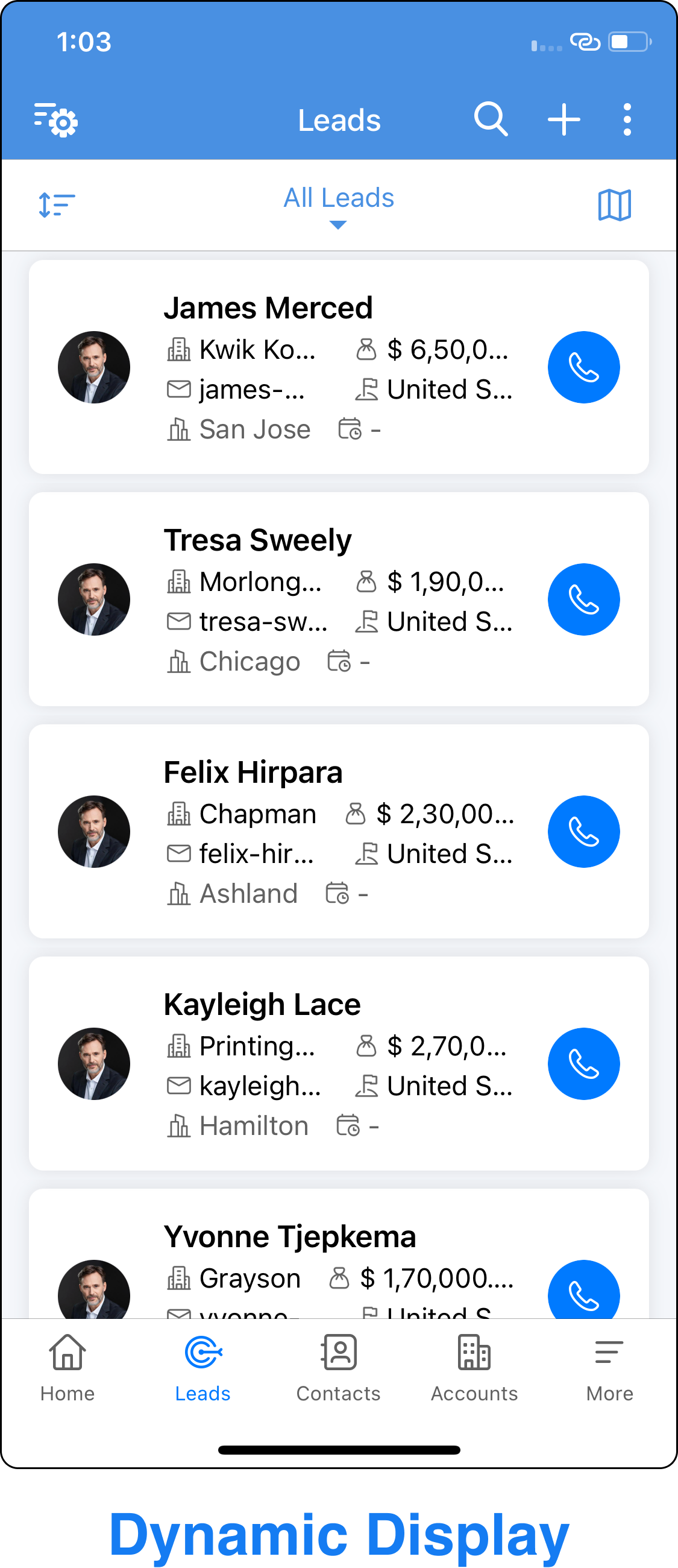 列表视图以有组织的顺序显示所有记录,帮助用户快速查找和管理他们的 CRM 数据。在 Zoho CRM 移动端支持动态显示后,用户现在可以自定义他们想要在列表视图的每条记录中显示的字段。这优化了移动设备上的有限屏幕空间,一眼就能看到最相关的信息,并允许快速访问关键数据。