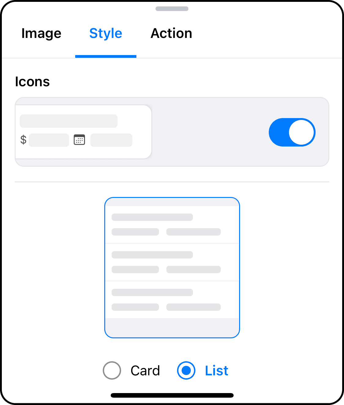 用户可以从两种选项中选择列表视图中记录的显示样式:列表和卡片。本节还包括一个切换按钮,用于在字段旁边显示图标。