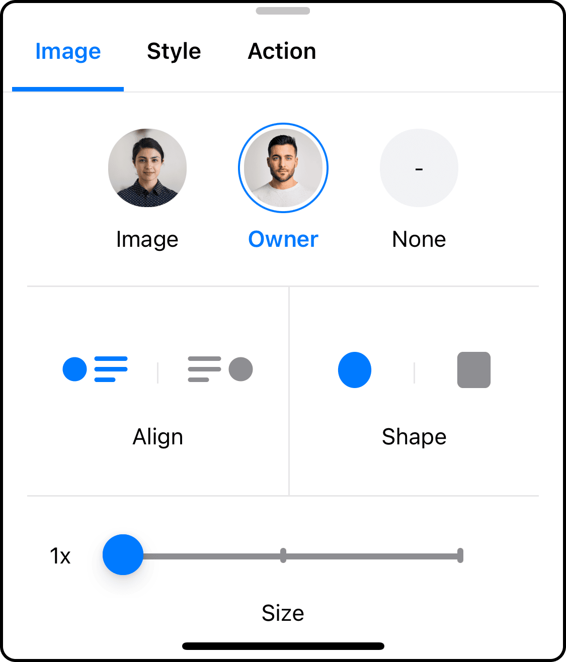 显示字段页面上的高级选项按钮允许用户进一步自定义每张卡片的外观。它提供三个高级设置:图片、样式 和动作。