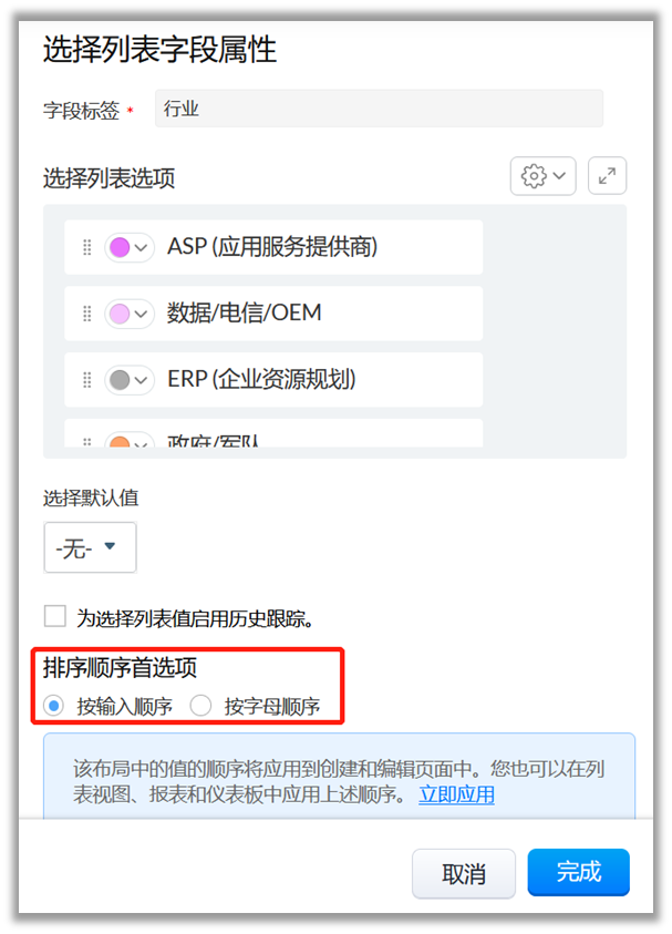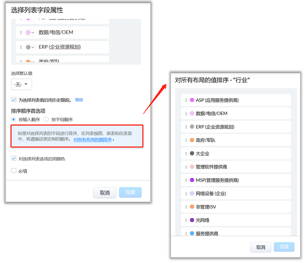 如果您在多个布局中关联了此选择列表,点击对所有布局的值排序。按所需顺序排列,点击完成。