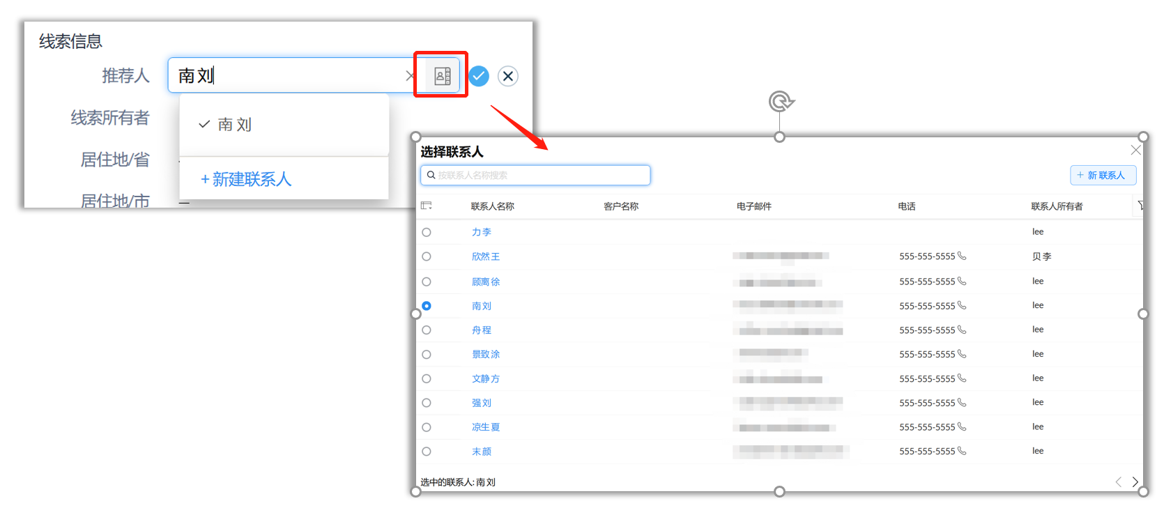 查找字段帮助您在不同模块之间建立关系(链接两个不同模块:“客户”和“联系人”)。例如,假定您的某些联系人推荐了多条线索。您想要快速查看谁推荐了哪条线索,您可以在“线索”模块添加一个“推荐人”的查找字段来实现,该字段将显示一个联系人列表。此关联是通过创建“查找”字段建立的。请注意,不能为“任务”和“活动”创建查找字段。