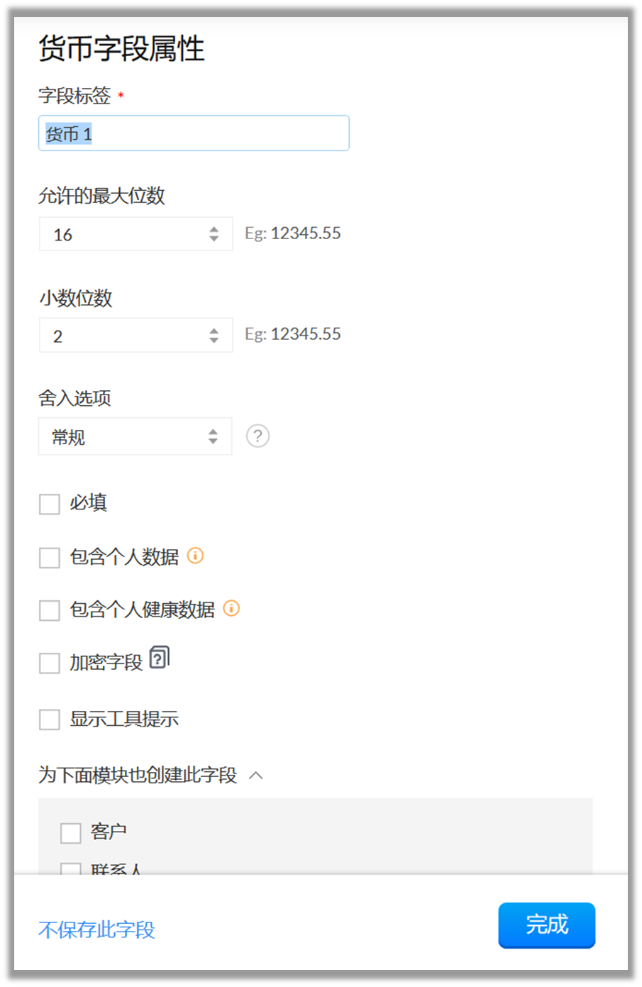 - 对于“线索”、“联系人”、“客户”和“商机”模块,您将见到名为“为下面模块也创建此字段”的附加选项。使用此项一次性为其他三个模块创建相同字段。此选项对自定义模块中的货币字段不可用。