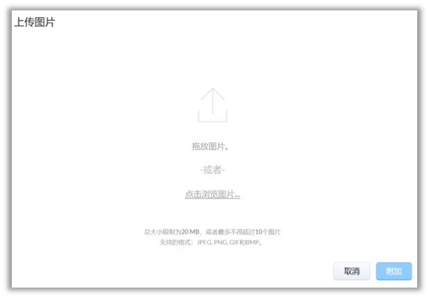 可同时上传最多 10 个图片,最大文件大小为 20MB,支持 jpg、png、jpeg、gif 和 bmp 格式(目前只能从本地上传)。