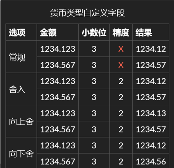 货币字段允许您根据所选货币设置定义小数和精度设置。Zoho CRM 中的货币字段有四个舍入选项: